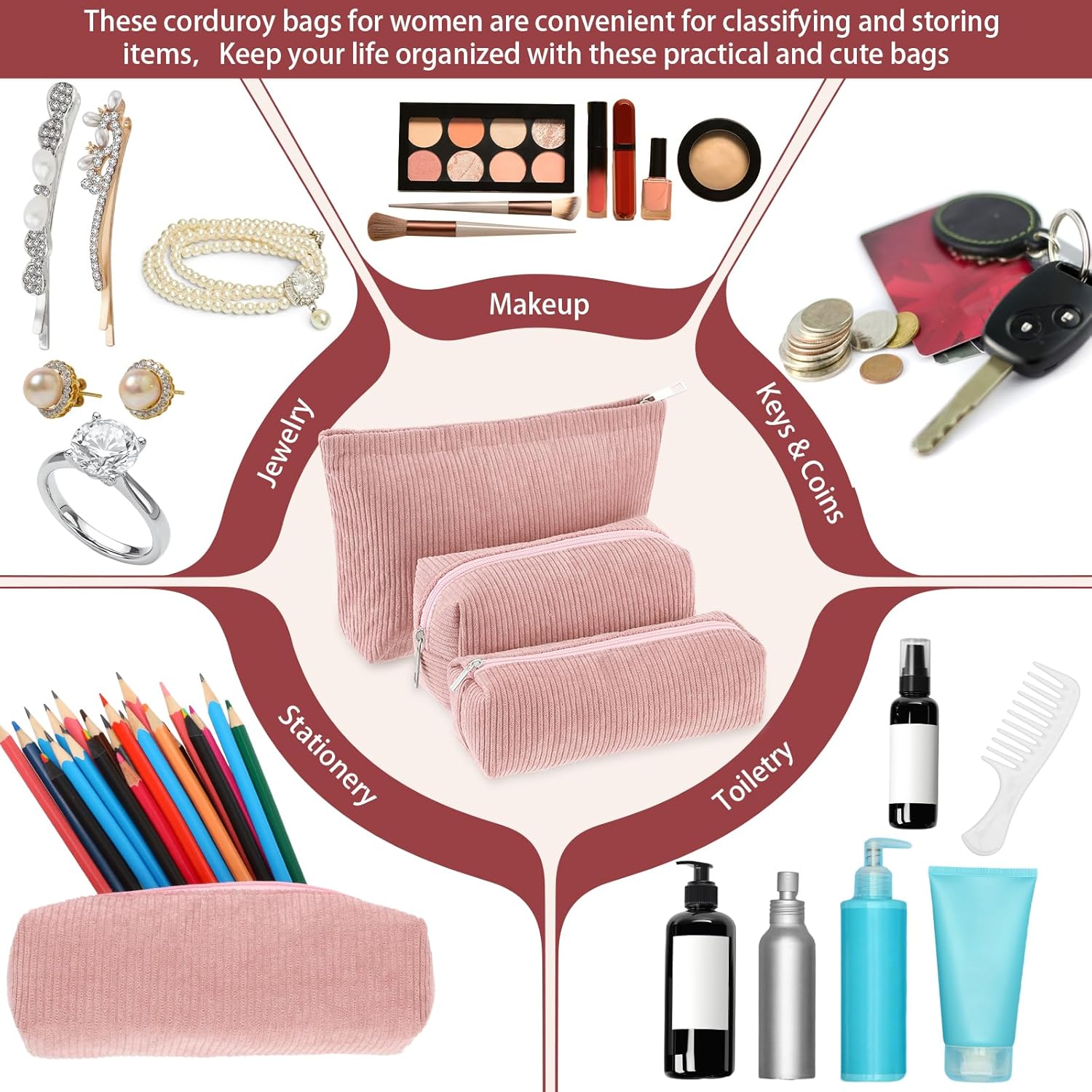 3 Pcs Makeup Bag Set for Women Corduroy Cosmetic Pouch Aesthetic Smile Travel Toiletry Bag Cute Purse Pouch Pencil Case Makeup Brushes Storage Organizer for Christmas(Pink,Solid Style)
