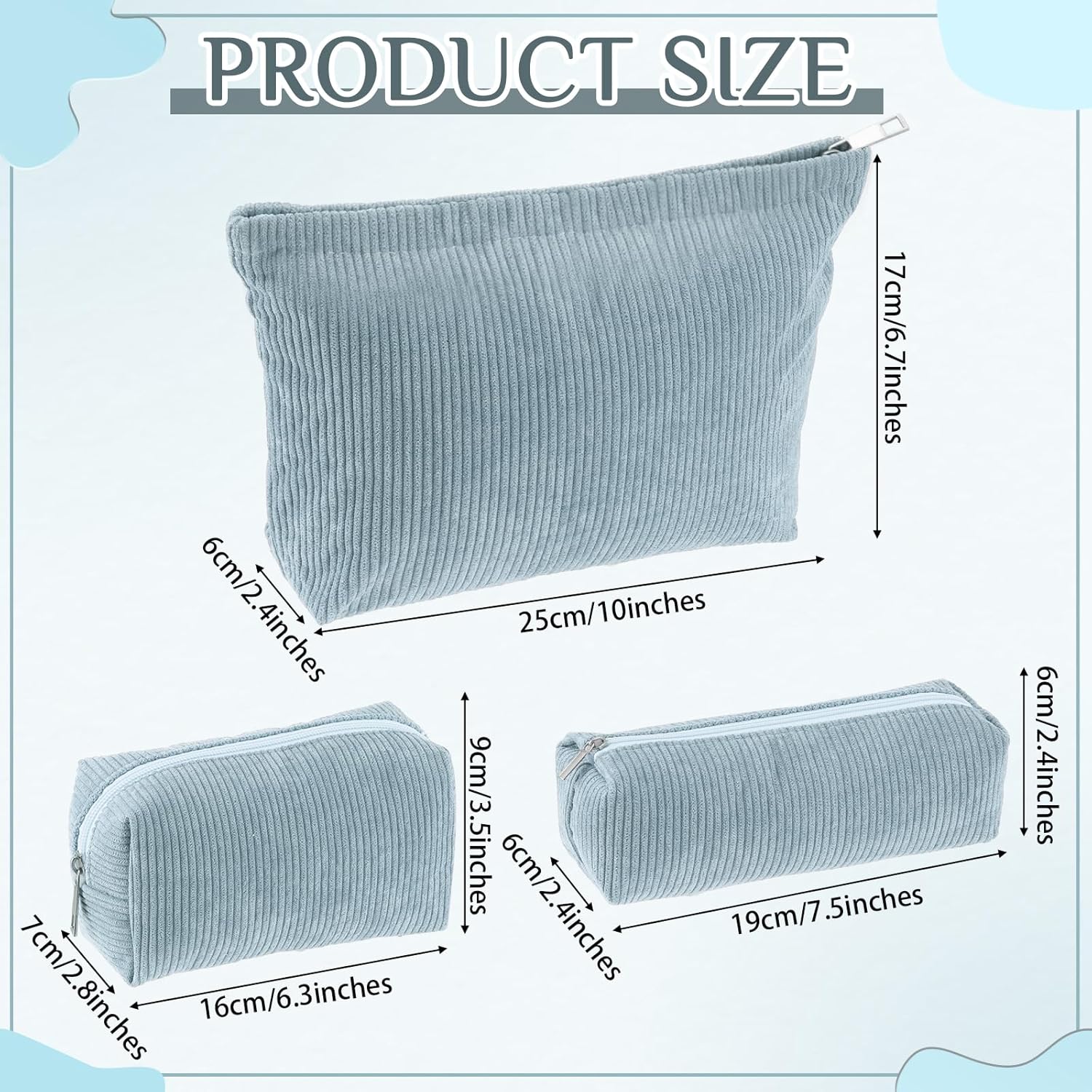 - Dimensions to Suit Your Needs: coming in 3 different sizes, about 10 x 2.4 x 6.7 inches/ 25 x 6 x 17 cm, about 6.3 x 2.8 x 3.5 inches/ 16 x 7 x 9 cm, and about 7.5 x 2.4 x 2.4 inches/ 19 x 6 x 6 cm, these corduroy bags for women are convenient for classifying and storing items; Keep your life organized with these practical and cute bags