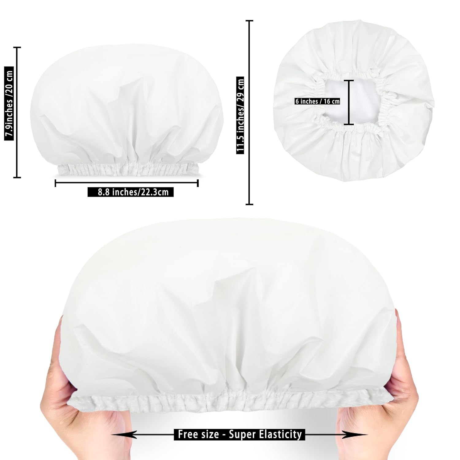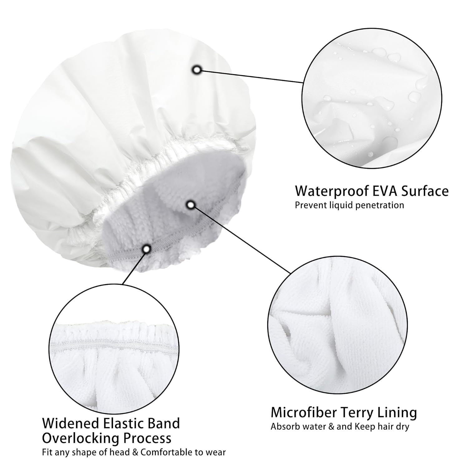 - DOUBLE LAYERS WATERPROOF SHOWER CAPS - Our reusable waterproof bath caps contains two layers, including a terry cloth inner layer and a water-resistant PEVA outer layer, which can effectively keep your hair from getting wet during showers or baths. Upgrade your shower experience.