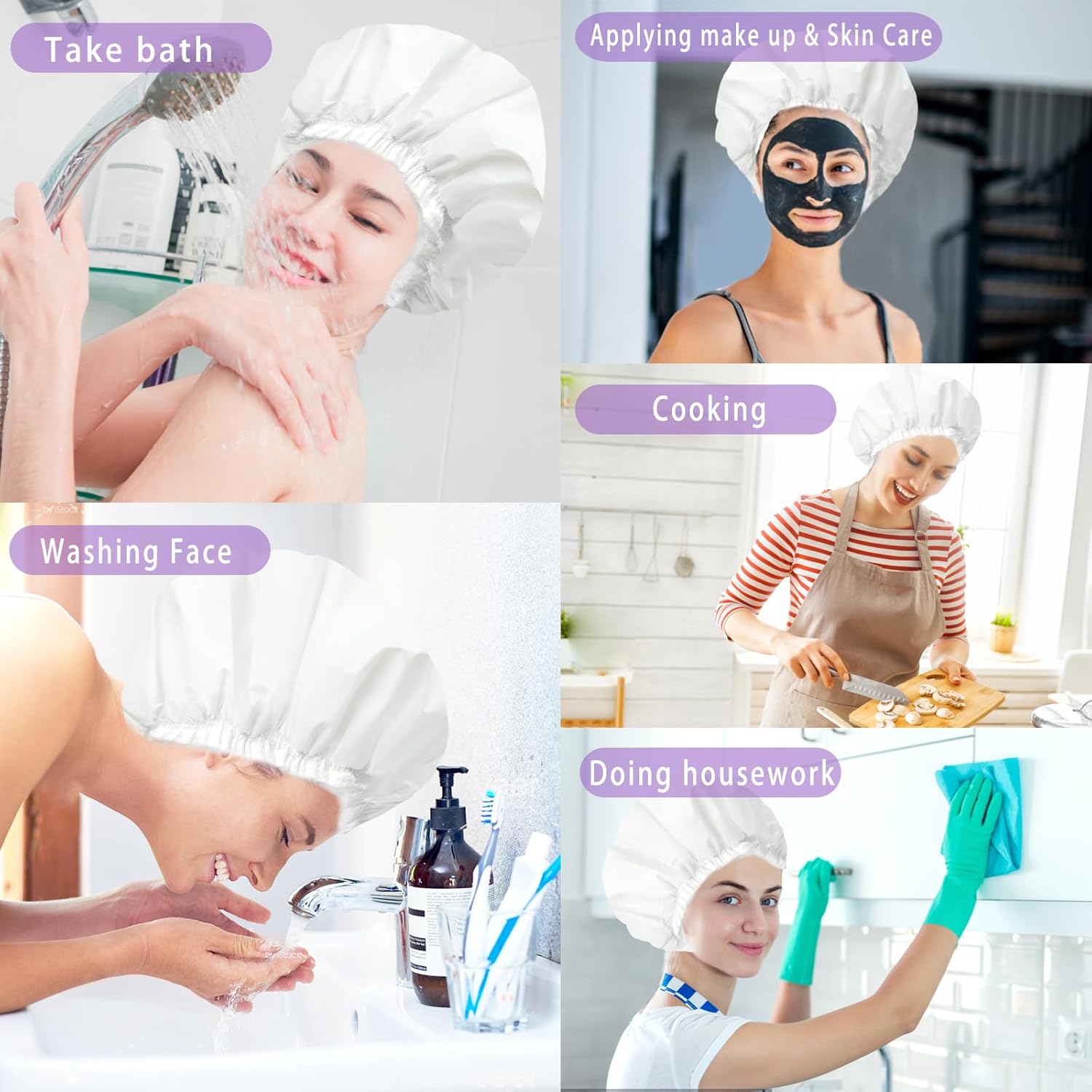 - WIDE APPLICATIONS - Our shower caps hair caps can fit for showering, cooking, home cleaning and SPA, keep your hair dry and block dust and oily fumes. Bath hair hat for women also can be used to tying hair when making up, cleaning face, applying facial mask, etc. Adding more convenience and beauty to your daily life.