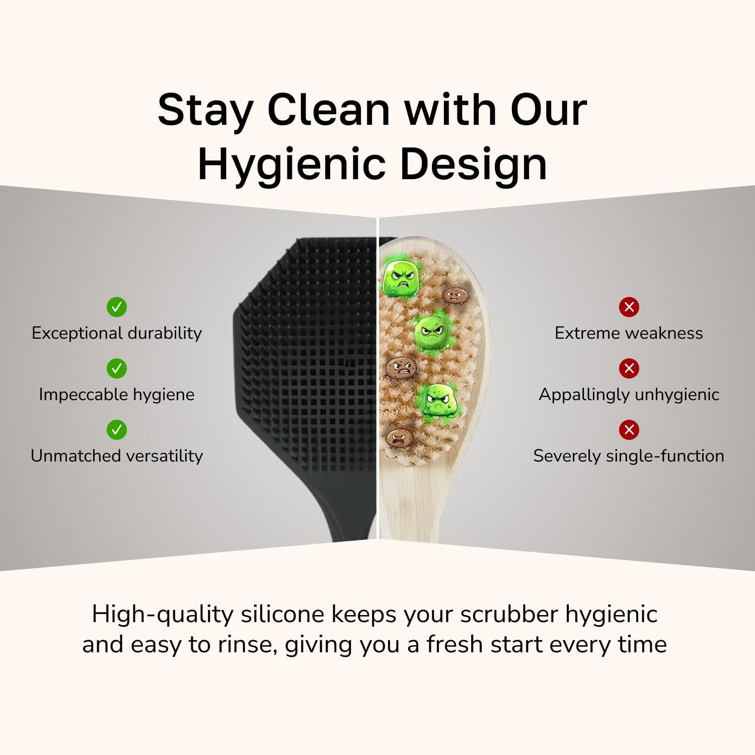 - Soft silicone that's gentle on your skin: Our scrubber is made of ultra-soft silicone that feels great on your skin but tough on dirt. It’s perfect for all skin types, even sensitive skin, giving you a soothing clean every day.