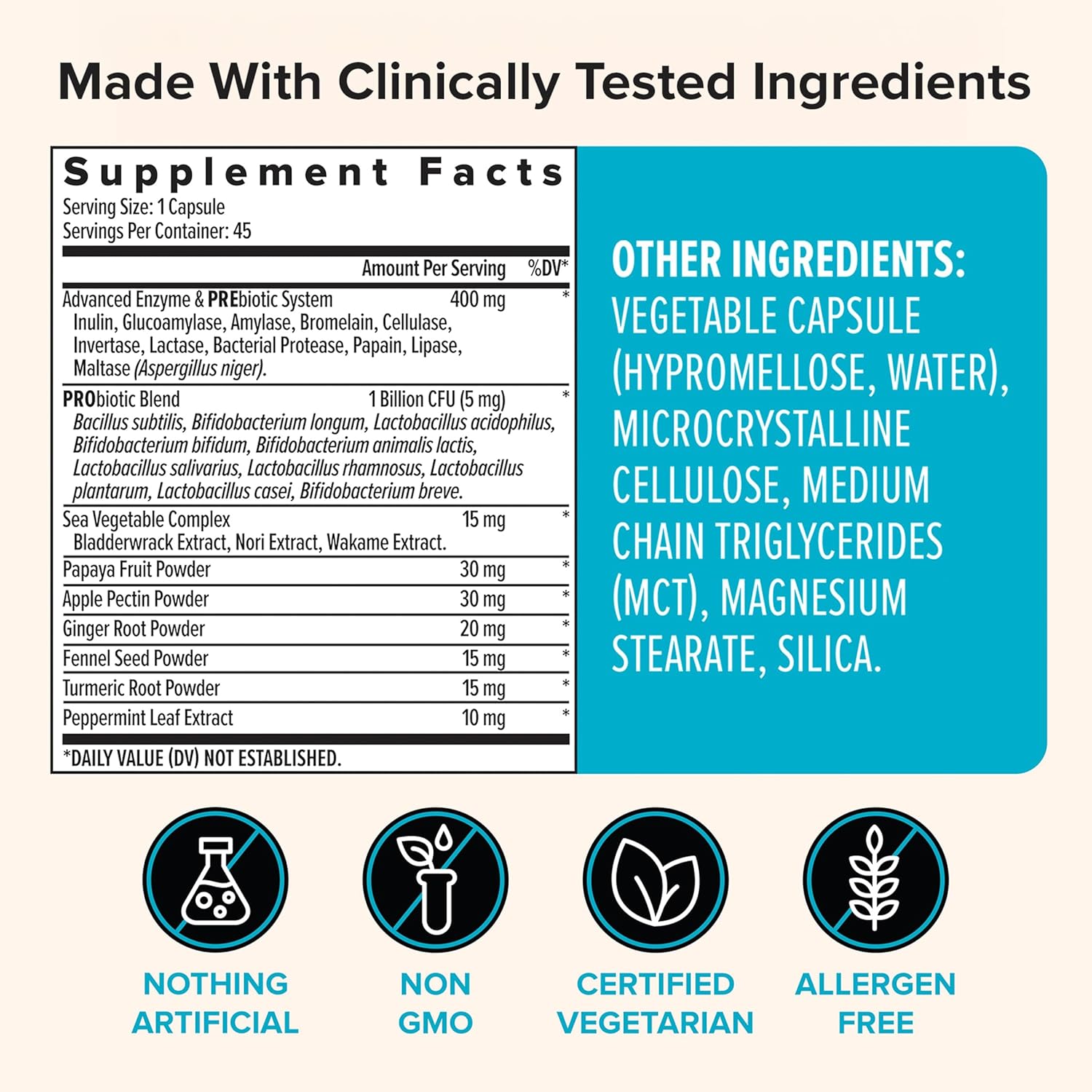 - 3-in-1 Formula – A potent blend of lab-proven enzymes, including bromelain and papaya, clinically proven probiotics, and prebiotics work synergistically to break down proteins, fats, and carbs while restoring digestive flora balance for optimal nutrient absorption and digestion. This formula helps maintain digestive wellness and promotes regularity.