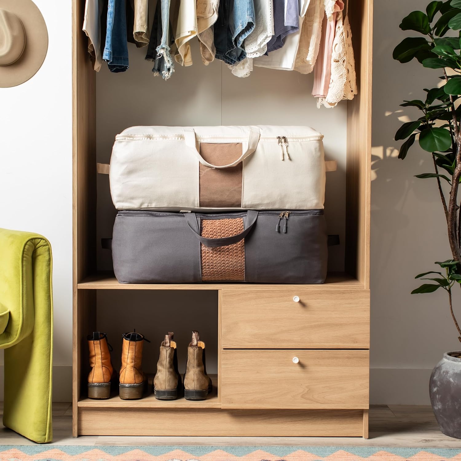 Soft Canvas Storage Bags with Zipper. Thick Breathable, 2pc King/Queen Comforter Organizer. Four Carrying Handles and Window. Large 25x19x9in Bag for Sheets Blankets Bedding Pillows, Clothes