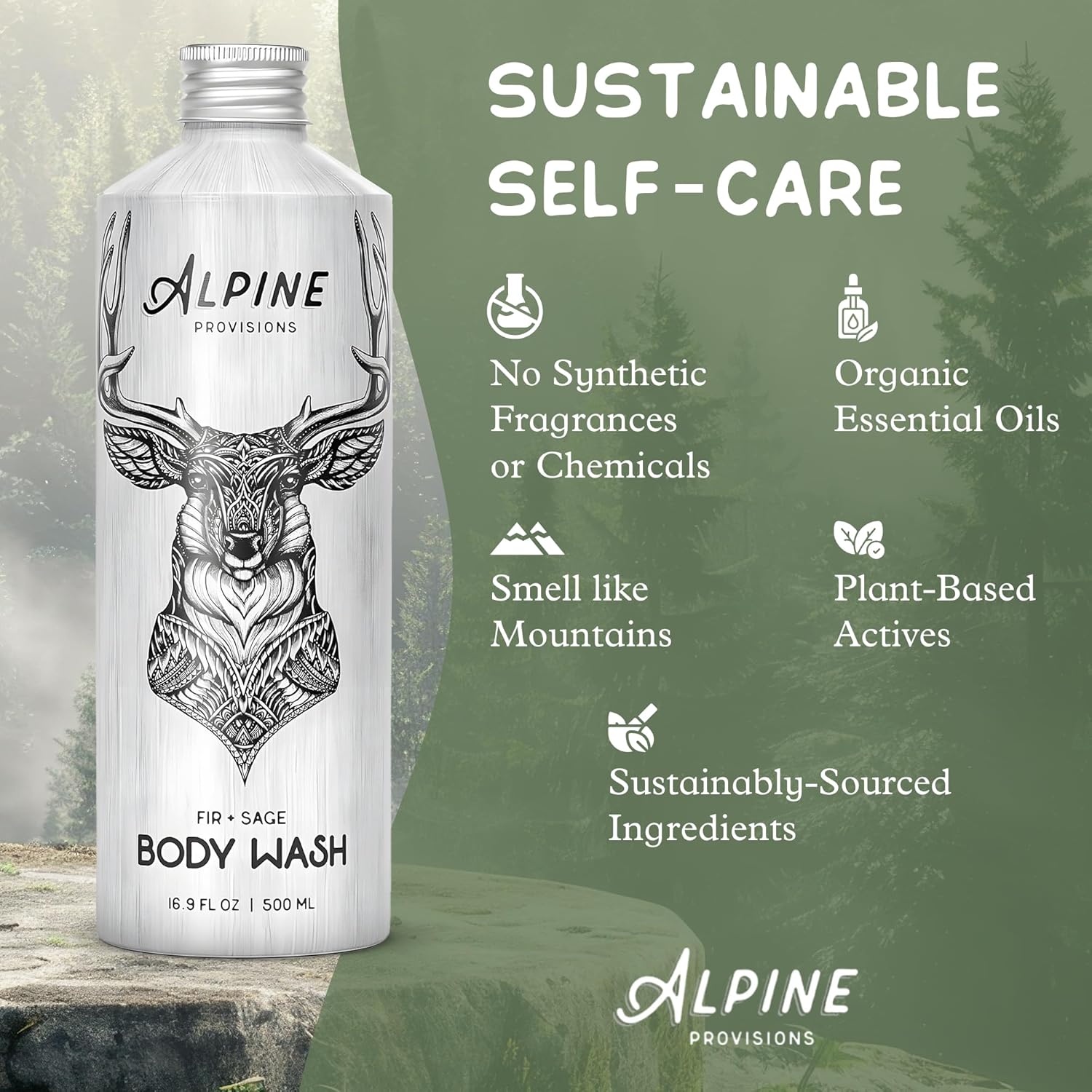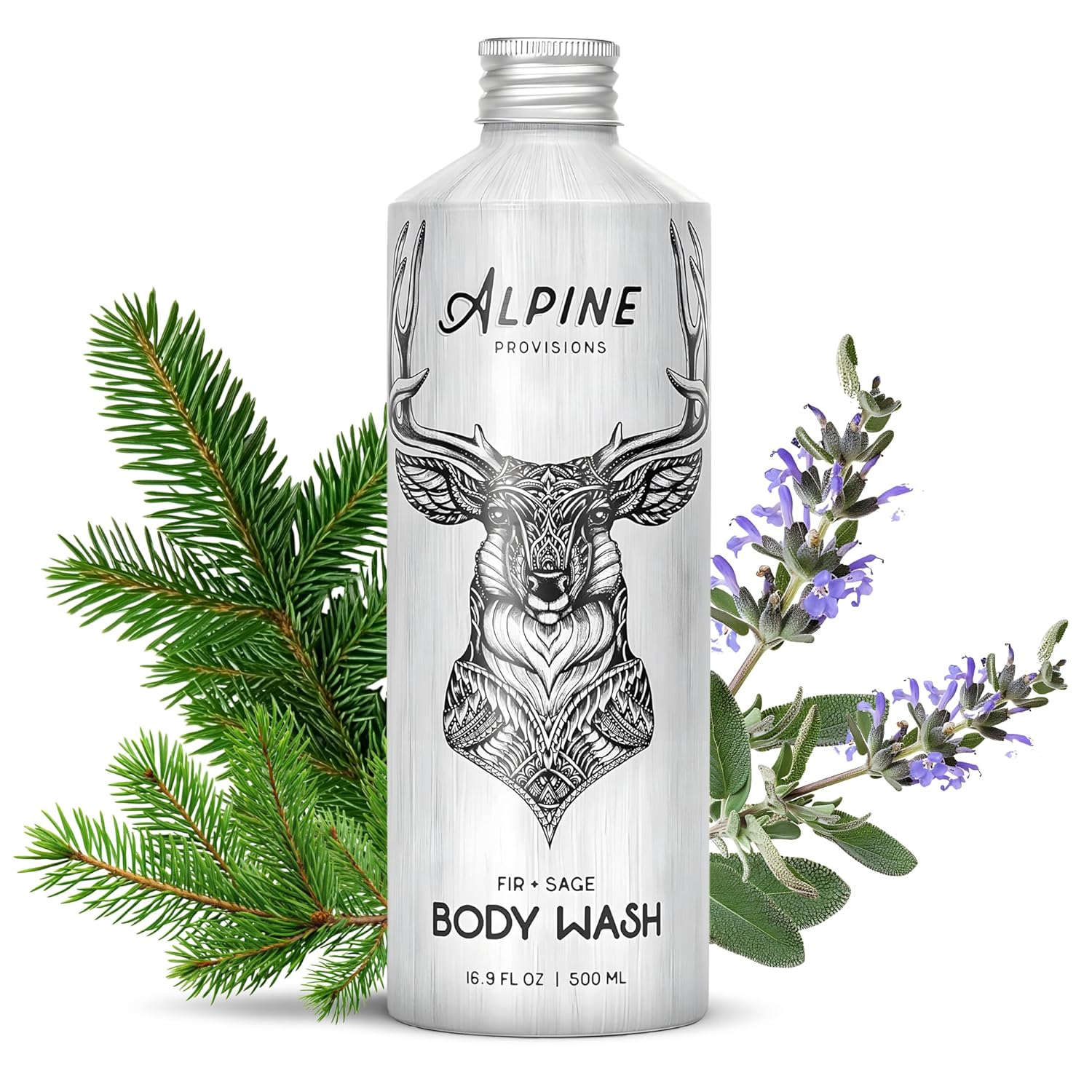 Alpine Provisions Natural Fir & Sage Moisturizing Body Wash – Refreshing with Essential Oils, Aloe Vera & Coconut Oil – Vegan, Sulfate-Free, Plastic-Free Aluminum Bottle – 16.9 FL Oz