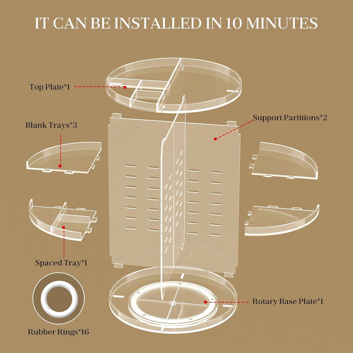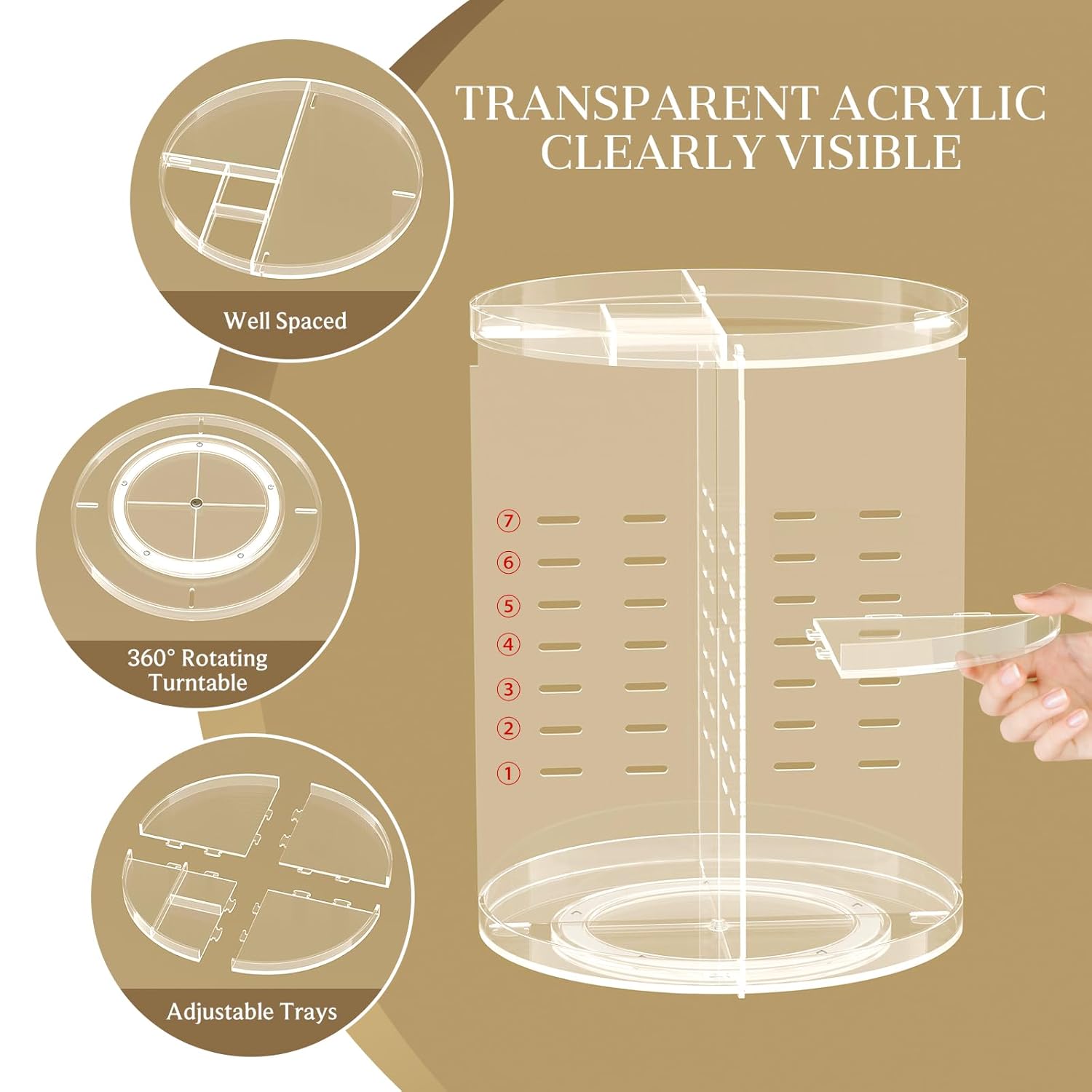 - ă7 ADJUSTABLE LAYERS & SAVE SPACEăâ¨360 rotating makeup organizer has four trays that you can adjust to easily store all your things. Ourmake up organizers can store at least 18 perfumes, 14 facial toners, 12 facial moisturizers, 8 makeup brushes, 6 powders, 5 makeup remover, etc. Save 70% of your desktop space.