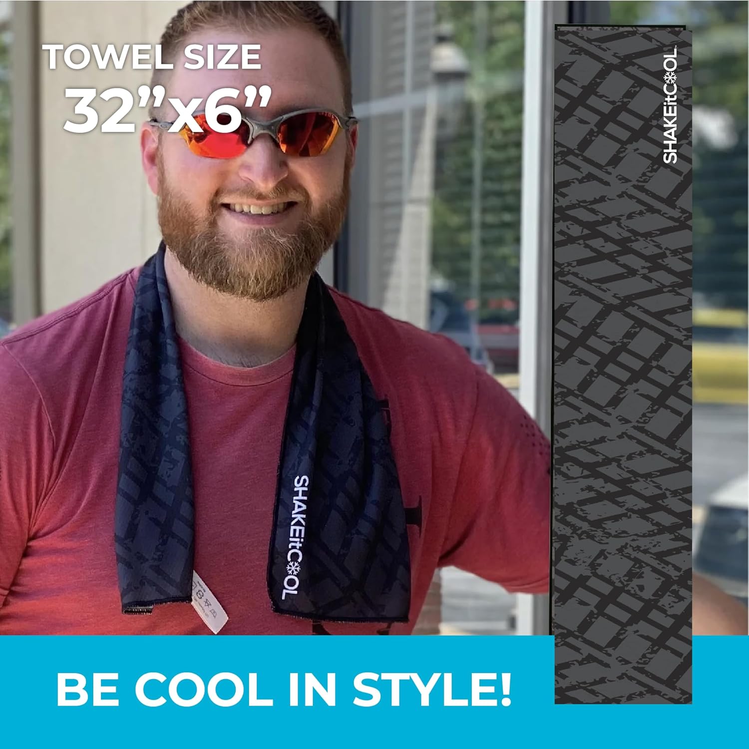 SHAKEitCOOL Original Cooling Towel – Be Cool in Style - Heat Relief, Soft, Lightweight, Sun Protection, Easy Clean - Perfect for Biking, Running, Yoga, Gym, Gardening - Black Tread