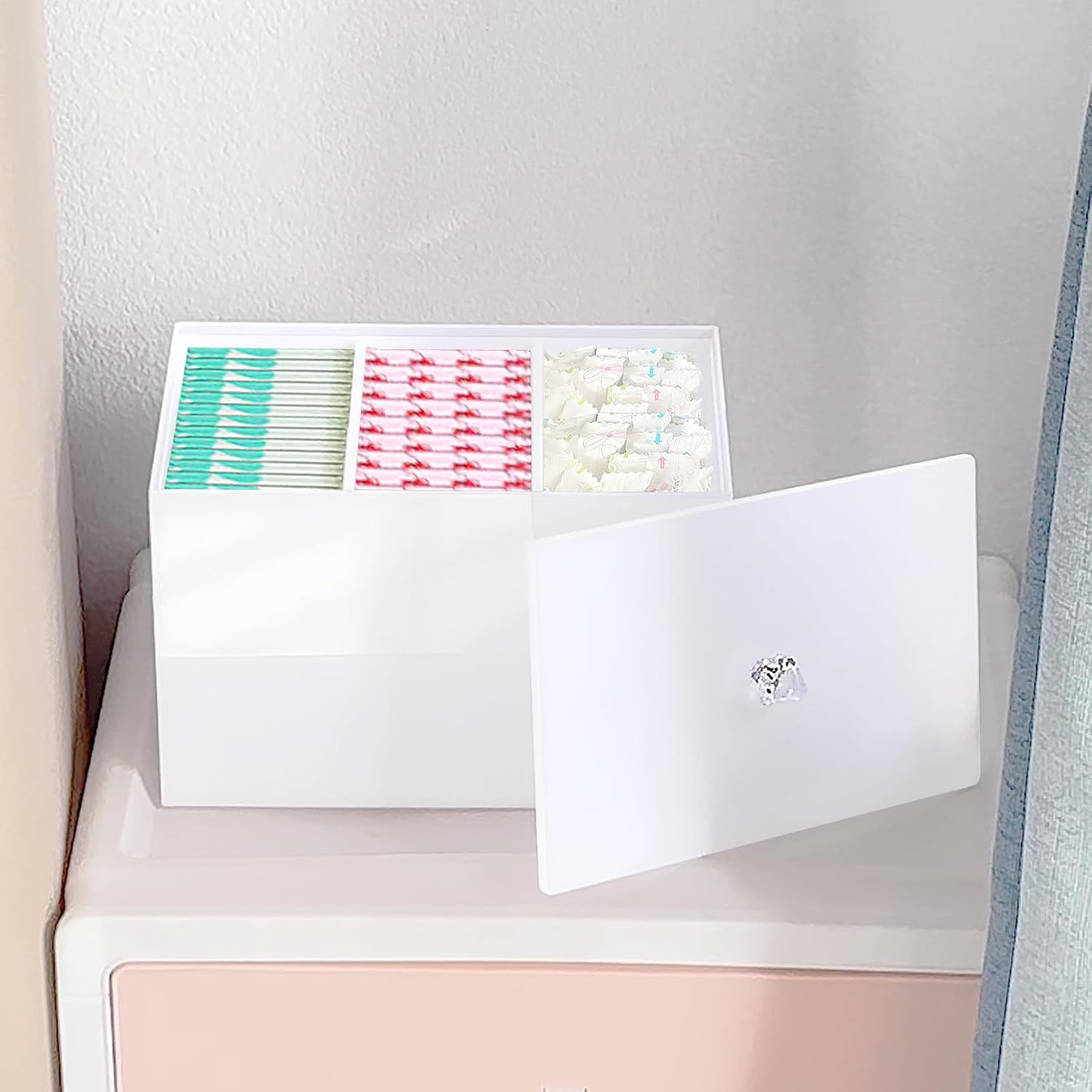 - USEFUL STORAGE BOX: This tampon organizer box fit a good amount of tampons, overnight pads, and regular sized pads, perfect way to store tampons in the bathroom countertops, under the sink, inside cabinet but doesn't take up a lot of space