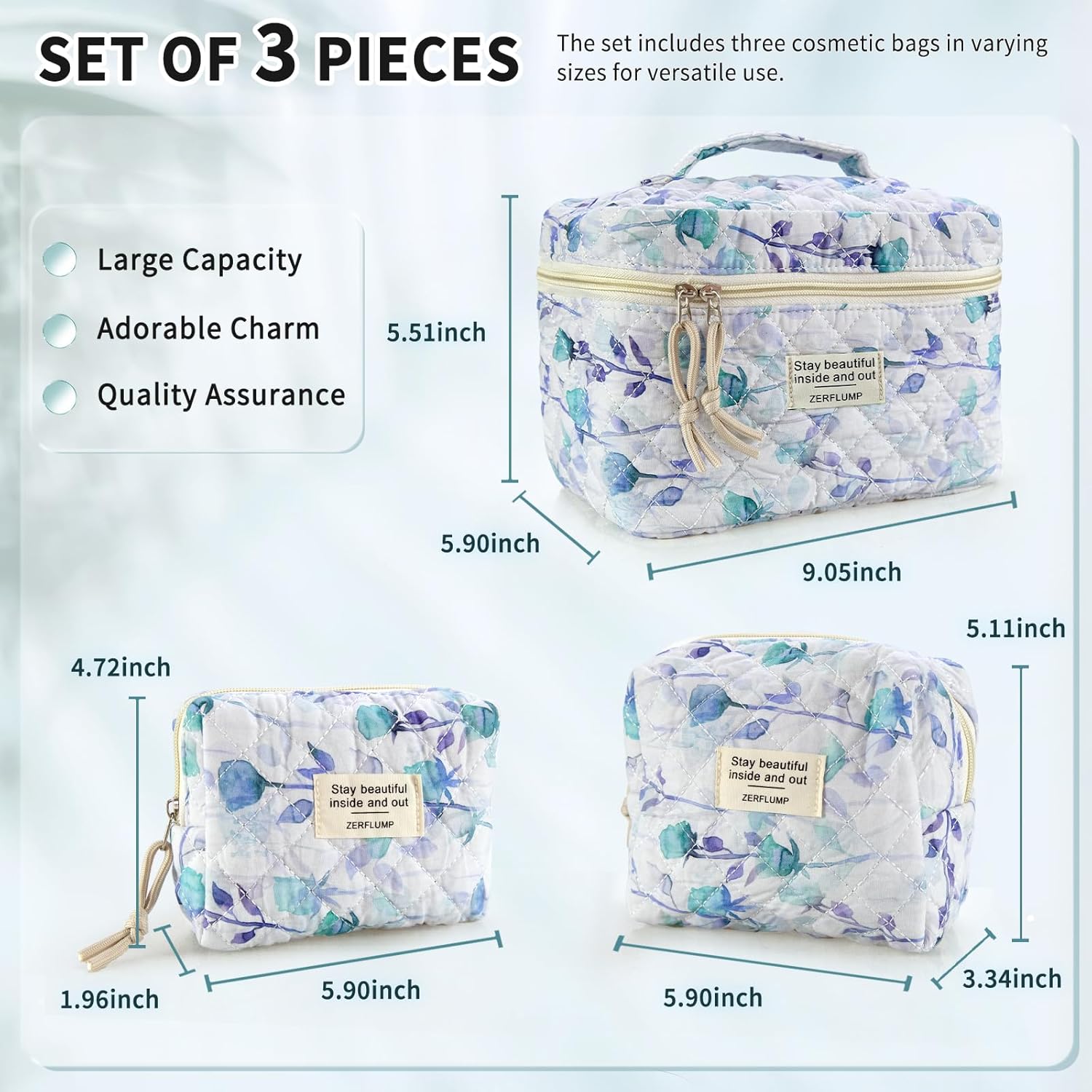 - Set of 3 Pieces: The set includes three cosmetic bags in varying sizes for versatile use. . The large size measures 9.05 x 5.9 x 5.51 inches, the medium size is about 5.90 x 3.34 x 5.11 inches, and the small size is around 5.90x 1.96 x 4.72 inches.