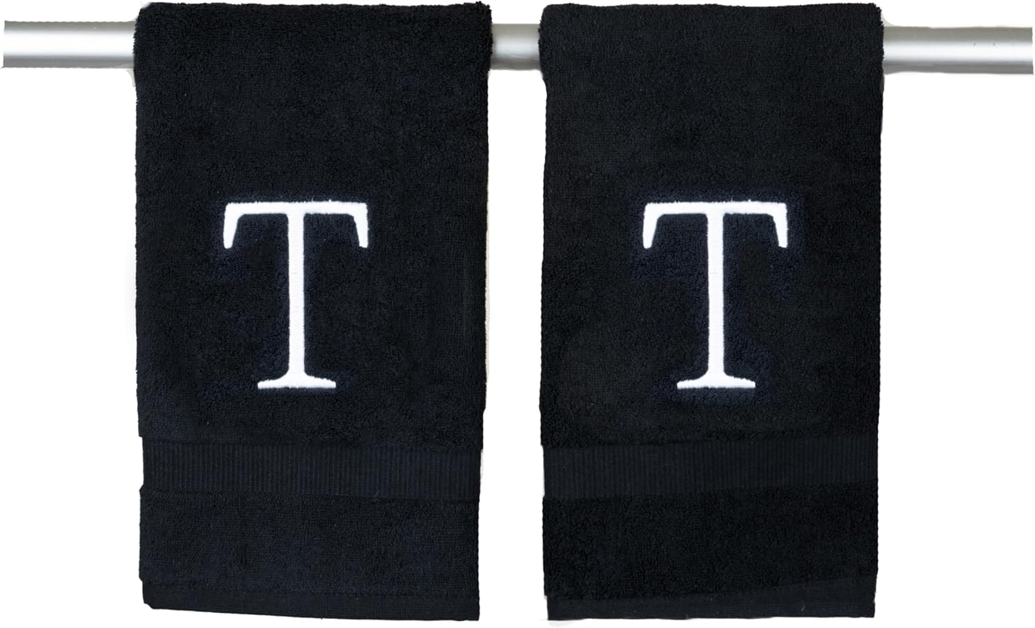 Black and White Bathroom Hand Towel - Monogrammed Luxury Hotel Quality Decorative Embroidered Towel for Powder Room, Spa - GOTS Organic Certified - Pack of 2, Letter T