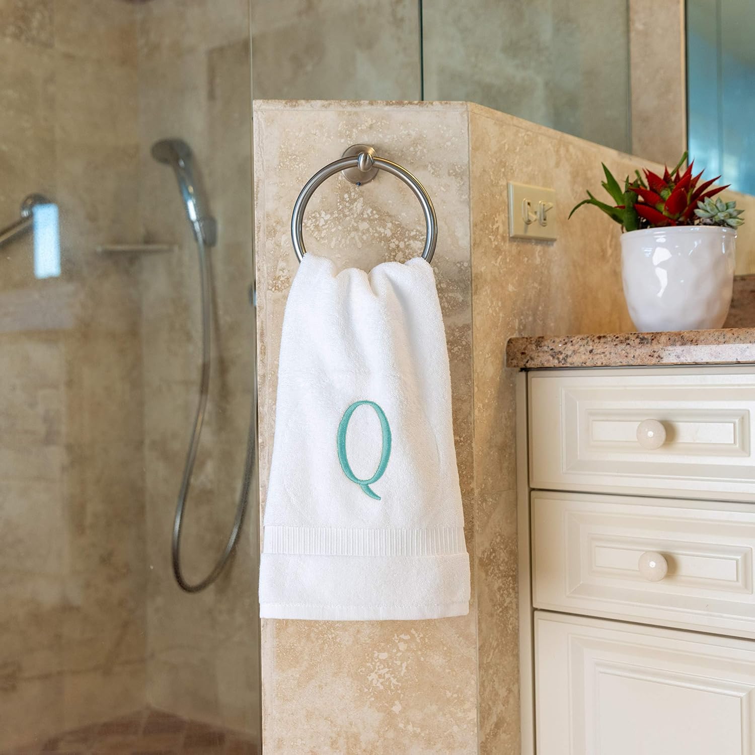 White Powder Room Hand Towel - Monogram Initial Hotel Quality Decorative Embroidered Luxury Towel for Spa - GOTS Organic Certified - Set of 2 Teal Letter Q