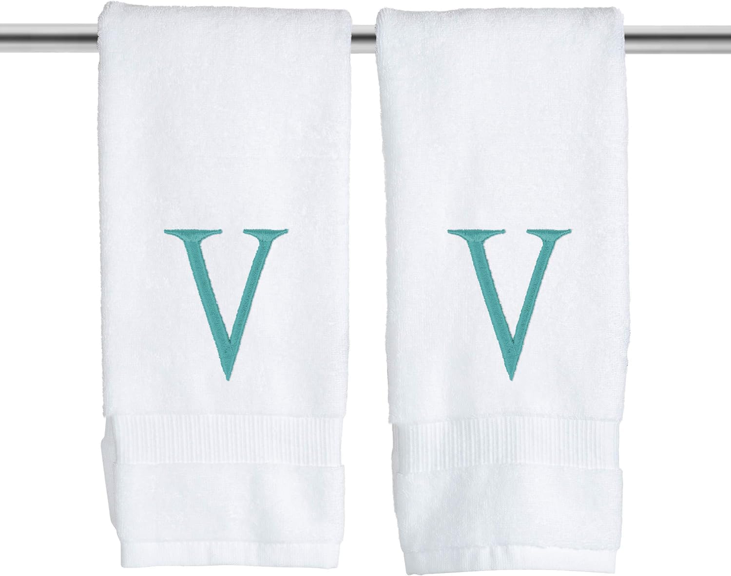Teal Initial Hand Towel for Bathroom - Monogrammed Luxury Hotel Quality Decorative Embroidered Towel for Powder Room, Spa - GOTS Organic Certified - Pack of 2, Letter V