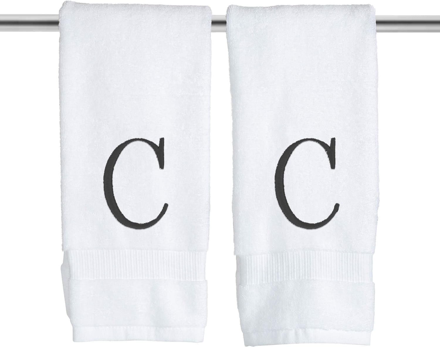 Black Initial Hand Towel for Bathroom - Monogrammed Luxury Hotel Quality Decorative Embroidered Towel for Powder Room, Spa - GOTS Organic Certified - Set of 2 Letter C