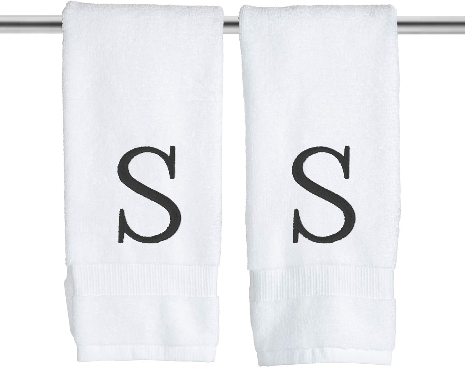 Black Letter Hand Towel for Bathroom - Monogrammed Initial Hotel Quality Decorative Embroidered Towel for Powder Room, Spa - GOTS Organic Certified - Set of 2 Letter S
