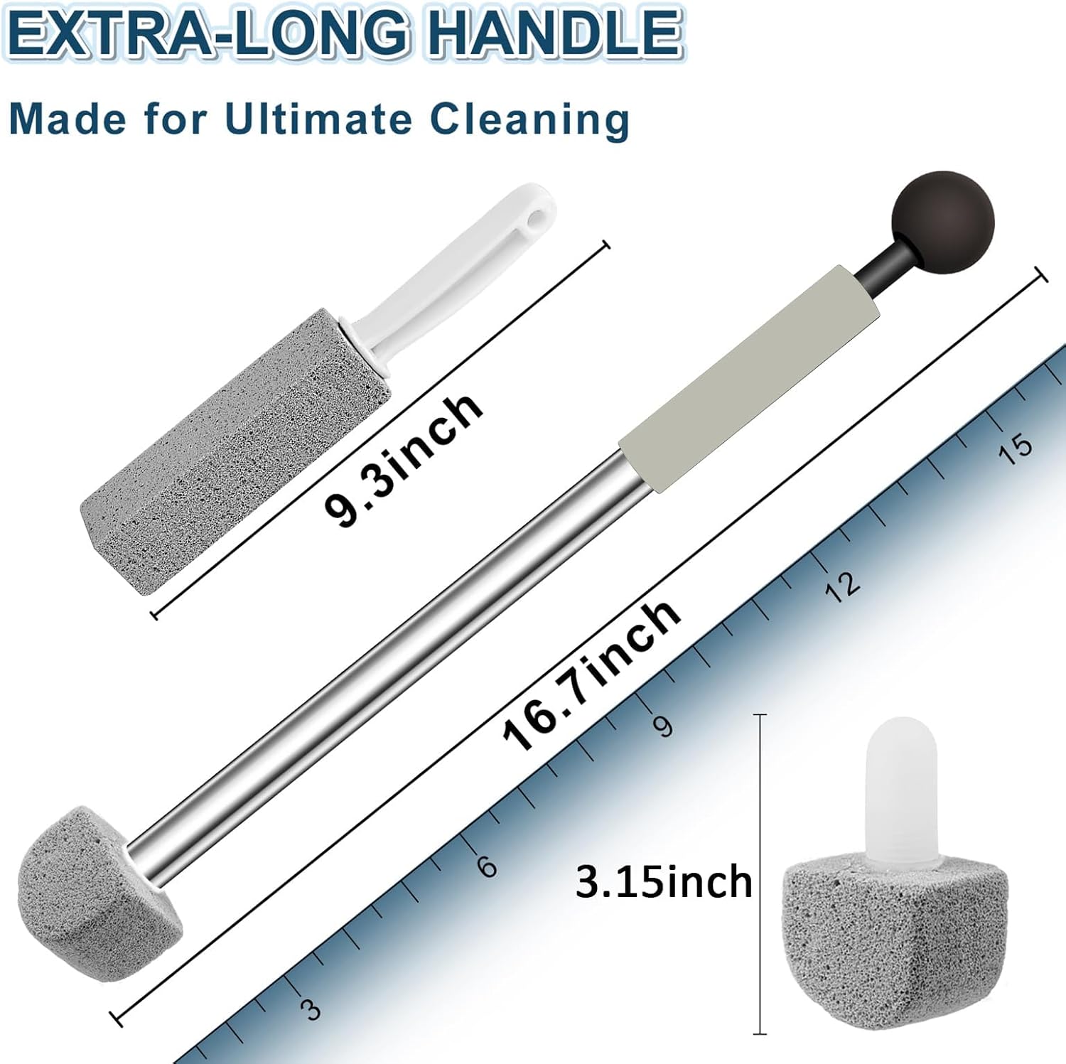 - [Extra Long Handle/Larger Size Pumice Stone]---NEW VERSION Pumice stone toilet bowl brush the size:16.71*1.77*1.6inch/42.5*4.5*4.2cm.Pumice sticks for cleaning is an easy-to-use cleaning tool that is designed to help remove clr calcium,lime&rust remover and hard water stain remover.It's a good toilet scrubber tool for everyone daily needs.