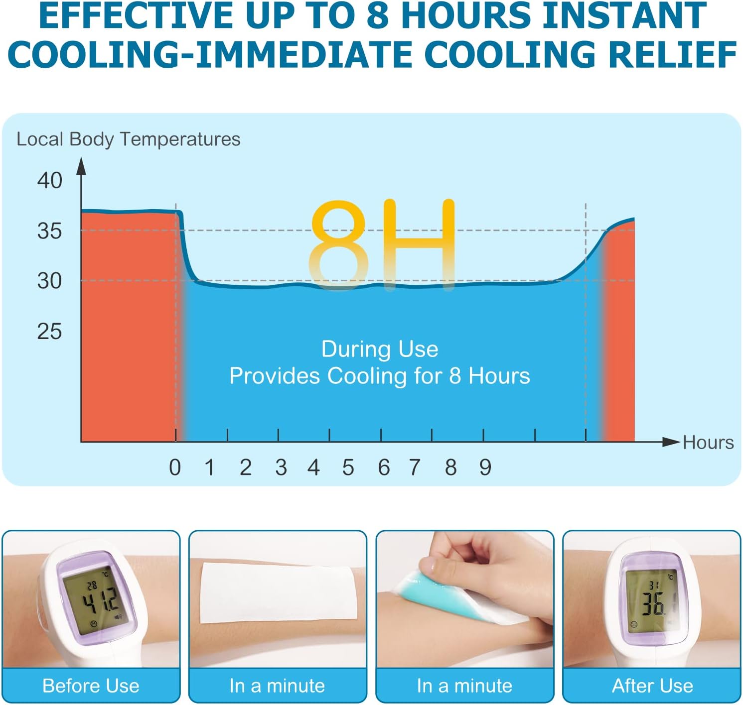- ❖Instant Cooling & Long Lasting - Immediate physical cooling relief, gentle skin-friendly, cool and comfort. Cooling effect of each sheet lasts up to 8 hours. Non-medicated formulation makes it safe to use with medication.