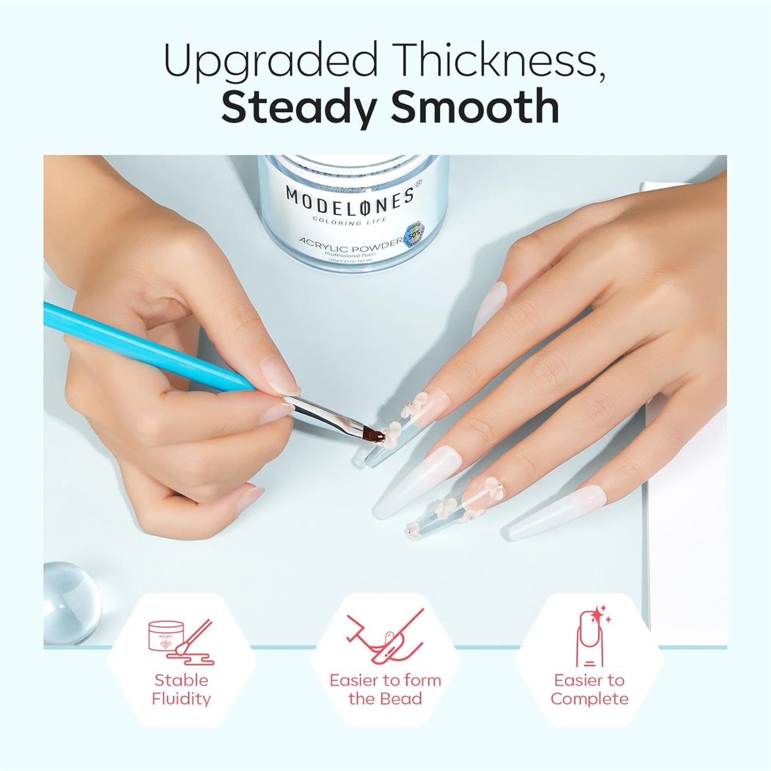 - VERSATILE CUSTOMIZATION:With modelones acrylic powder, the options are endless – from timeless French tips to bold and intricate designs. You're in control, shaping the length, thickness, and style of your acrylic nails to match your unique flair, leaving you with a set of nails that's all about you and your personal style.