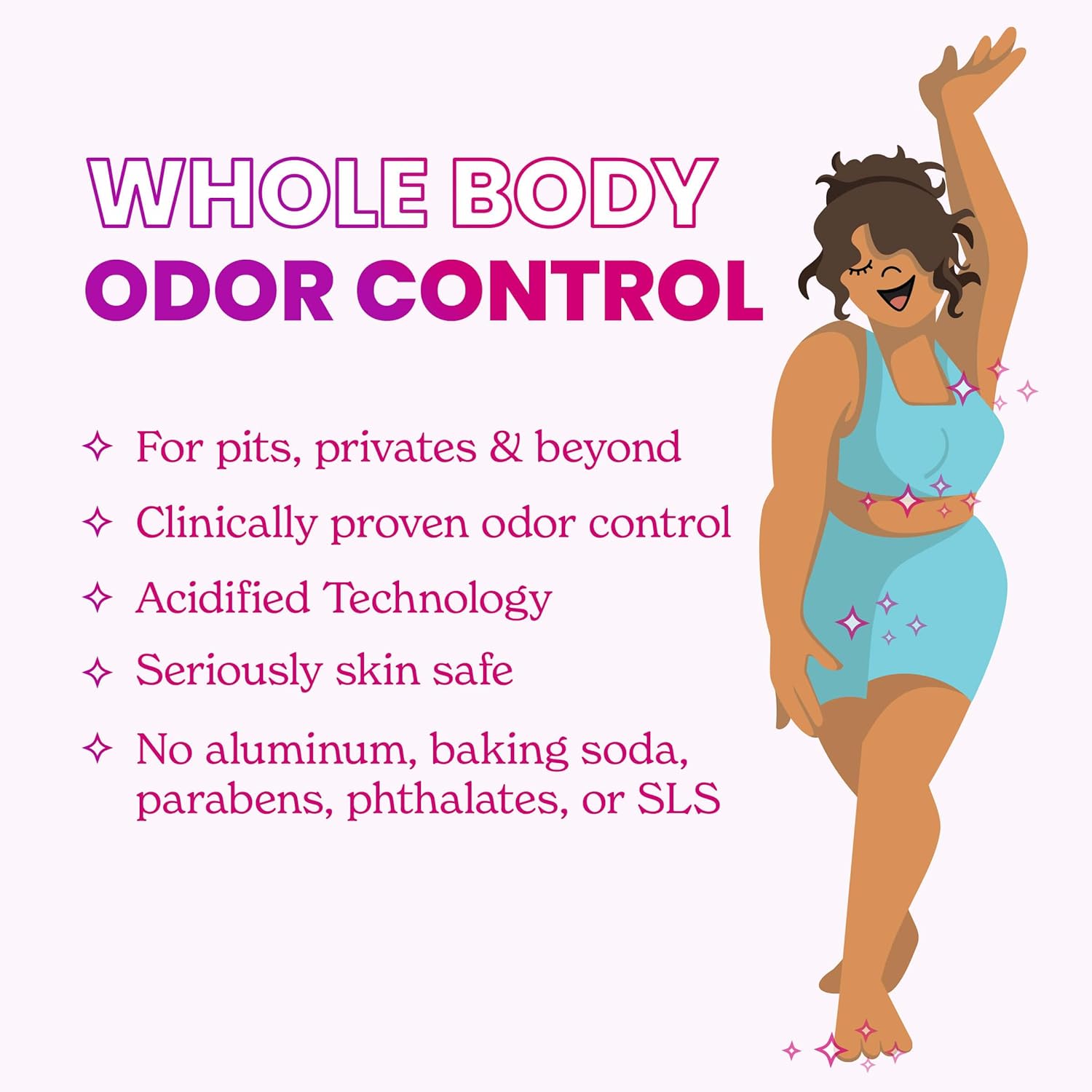 - SMELL BETTER EVERYWHERE - Odor control for pits, privates and beyond—think feet, underboob, belly buttons, tummy folds, butt cracks, thigh creases or anywhere else you have odor but wish you didn’t.