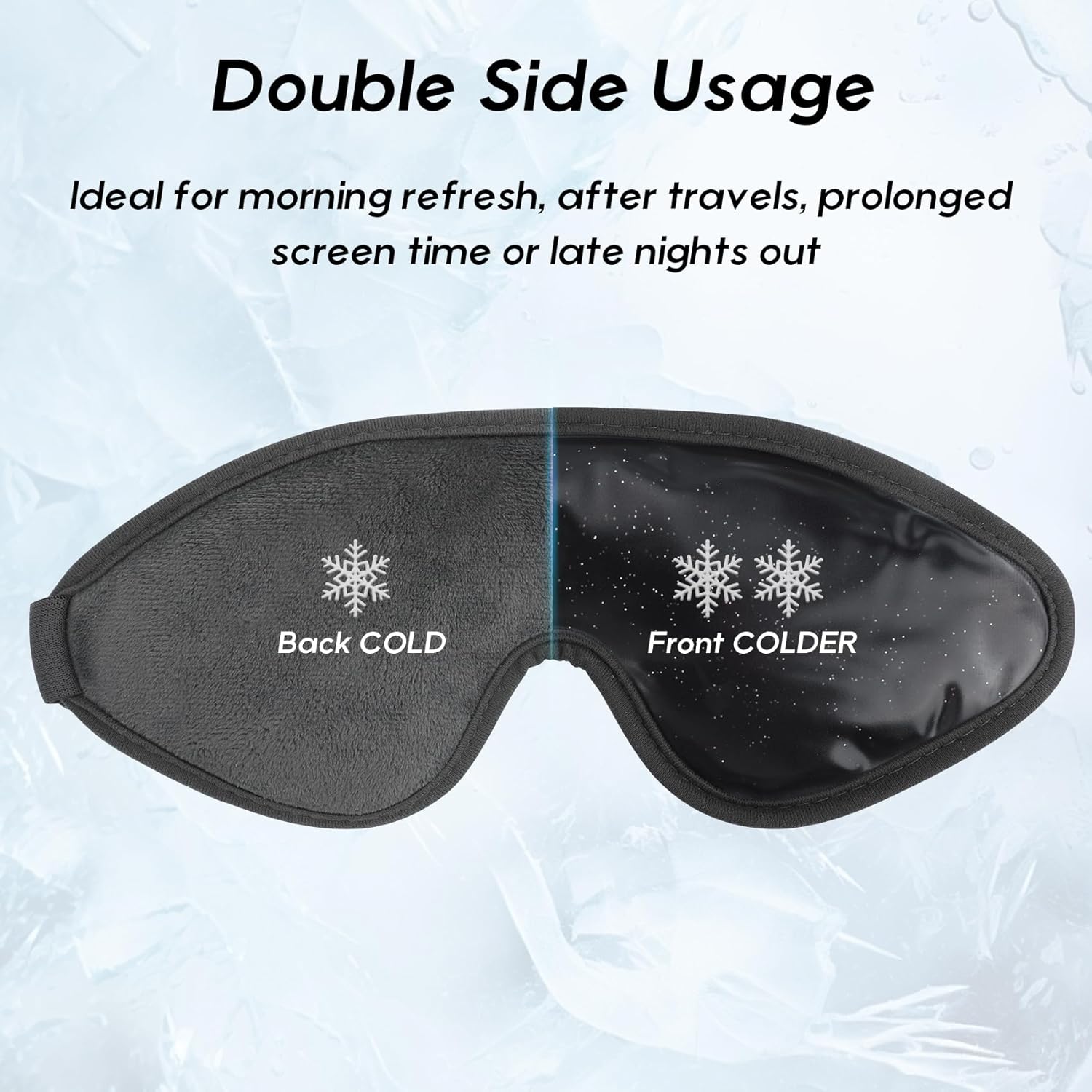 - One Side Cooling, One Side Cold: Our eye mask features a soft plush side and a breathable PVC side. The plush side offers gentle cooling without feeling too cold, making it ideal for use as a sleep mask during home relaxation, yoga meditation or work breaks. On the other hand, the PVC side brings you a colder experience, perfect for morning refreshment, soothing and unwind.