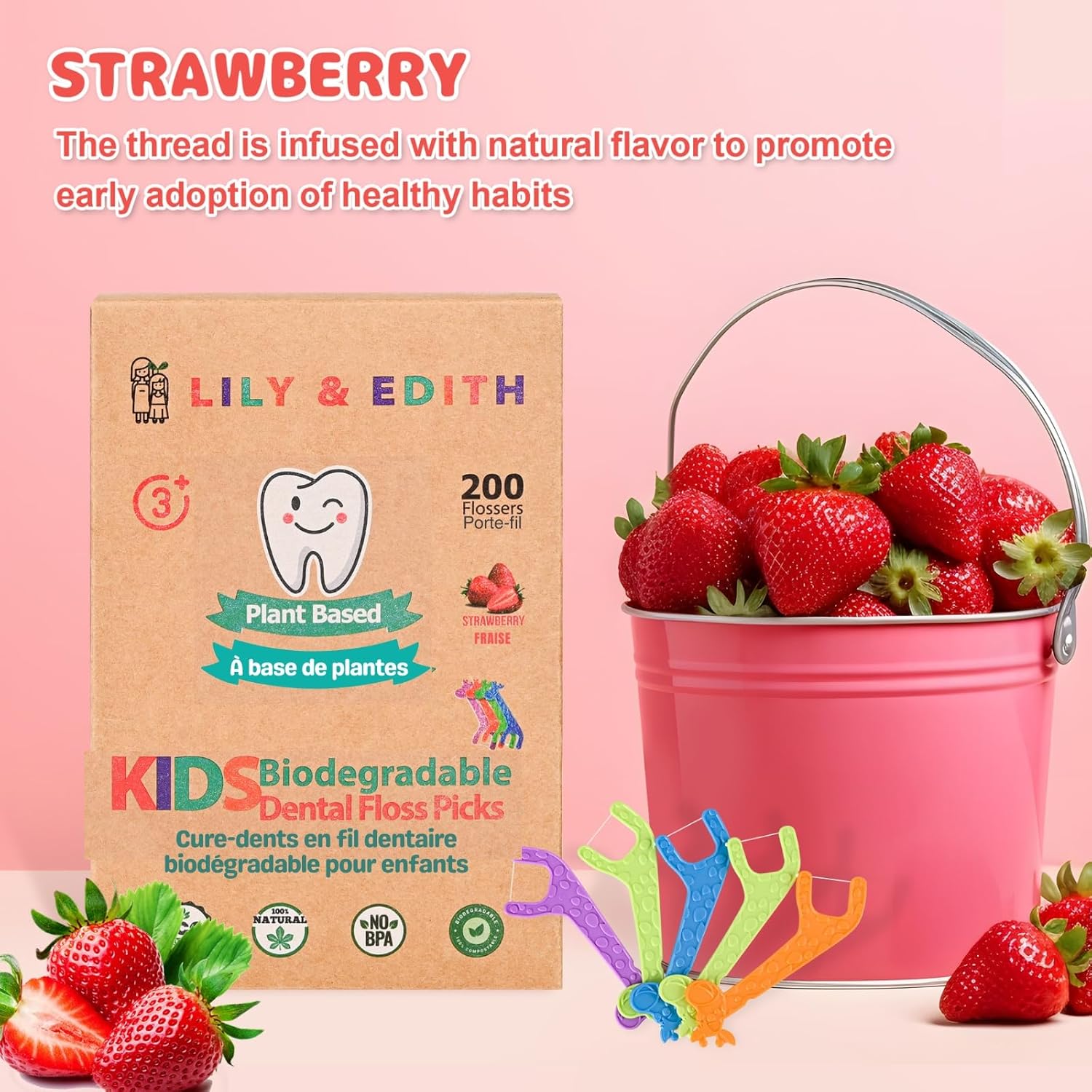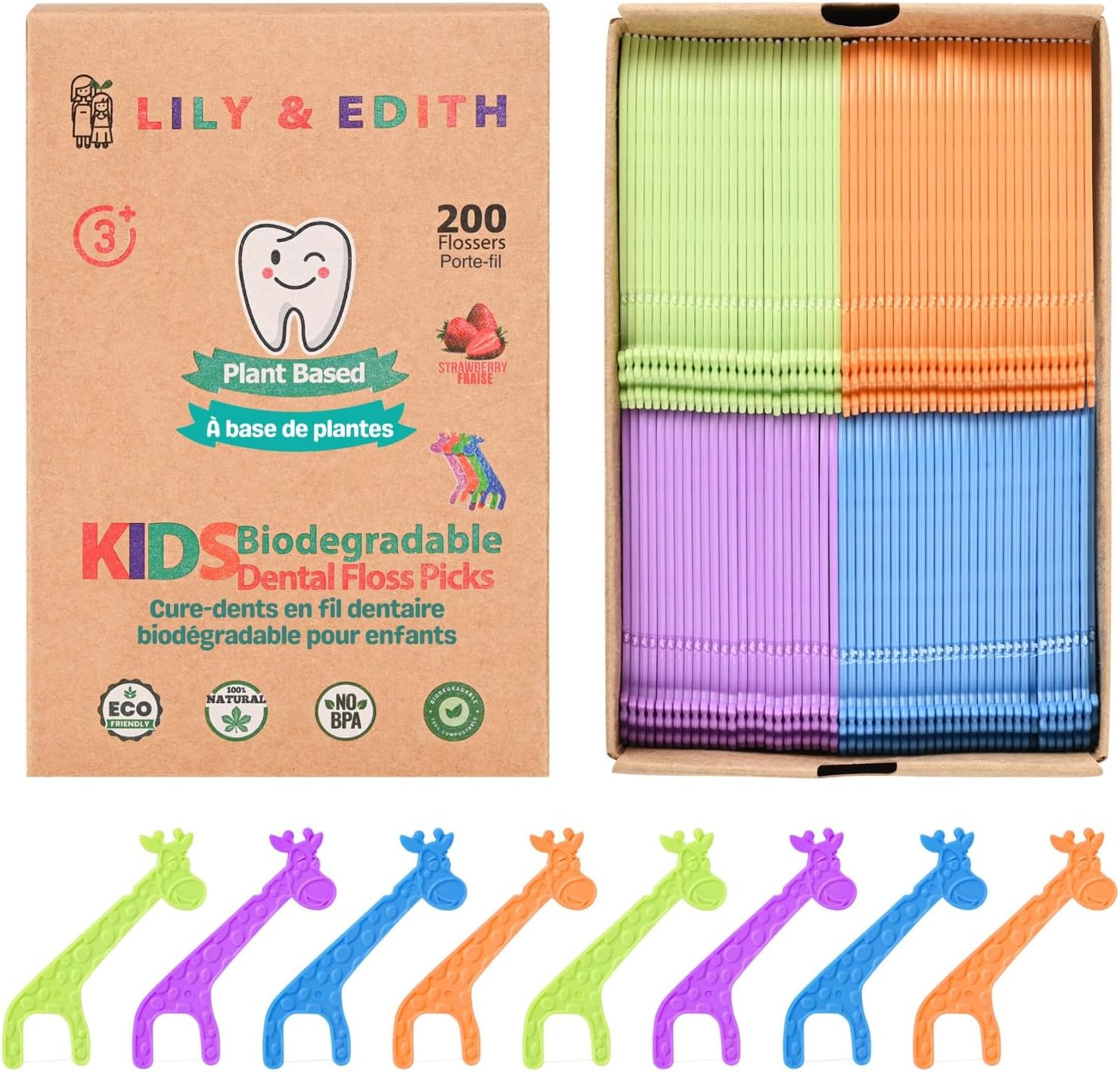 LILY & EDITH Kids Plant Based Dental Floss Picks 200 Counts, Fluoride Free, Corn Starch Material, Chemical Free, Fun Animal Flossing Sticks, Ultra Sturdy Thread, Zero Waste Package (Strawberry)