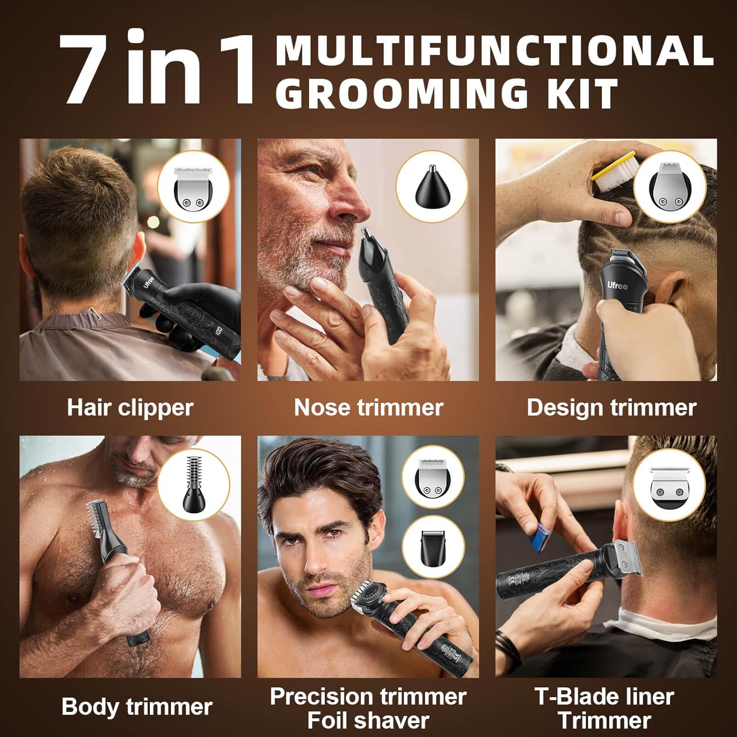 Ufree Beard Trimmer for Men, Electric Razor Shavers, Cordless Hair Clippers, 7 in 1 Beard Grooming Kit for Mustache, Body, Nose and Facial, Gifts for Men