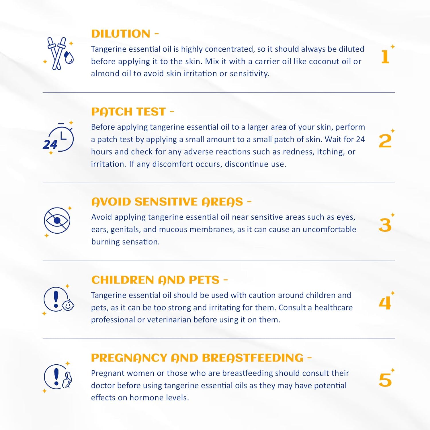 - Body Massage: Dilute 1 drop of tangerine essential oil with 10 to 20 drops of a carrier oil (Sweet Almond, Grapeseed or Jojoba). Take an appropriate amount of the blended oil on your palm and apply the oil in a circular motion on the body parts that need to be massaged, which can relax the body and mind and relieve stress