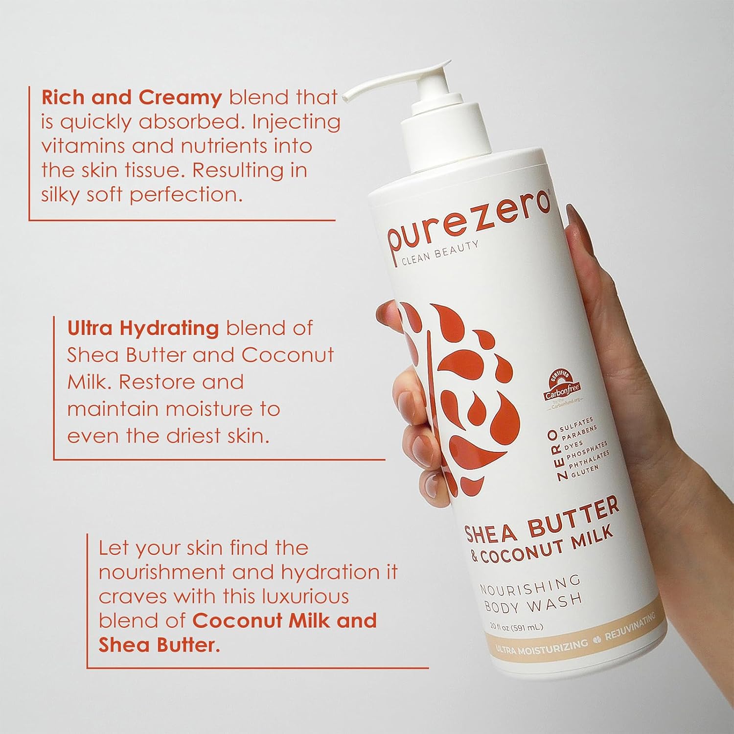 Purezero Shea Butter & Coconut Milk Body Wash, Leaves Skin Hydrated and Fresh, Maintain Elasticity and Smoothness, Zero Sulfates, Parabens, Dyes,100% Vegan & Cruelty-Free (20oz, 2 Pack)