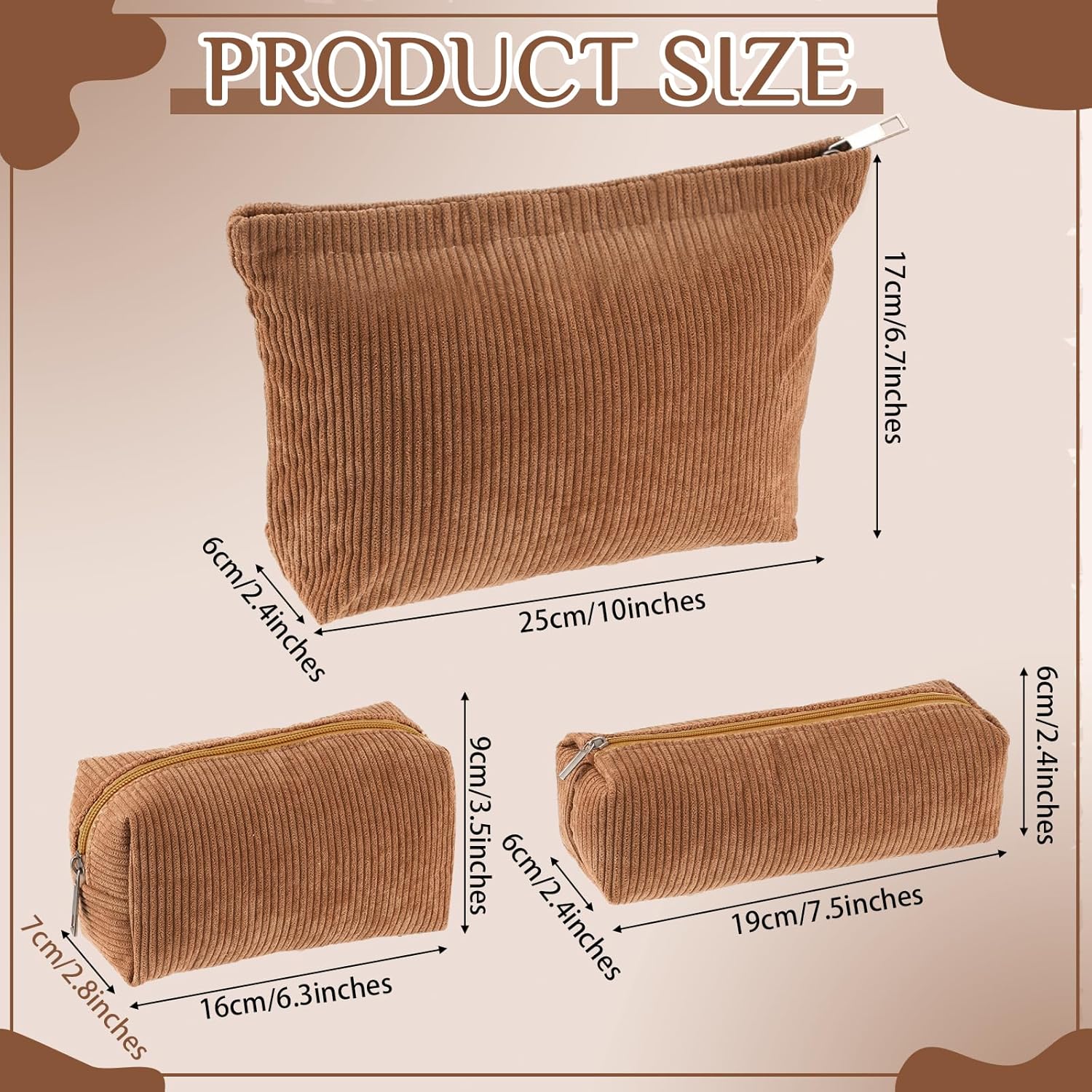 - Dimensions to Suit Your Needs: coming in 3 different sizes, about 10 x 2.4 x 6.7 inches/ 25 x 6 x 17 cm, about 6.3 x 2.8 x 3.5 inches/ 16 x 7 x 9 cm, and about 7.5 x 2.4 x 2.4 inches/ 19 x 6 x 6 cm, these corduroy bags for women are convenient for classifying and storing items; Keep your life organized with these practical and cute bags
