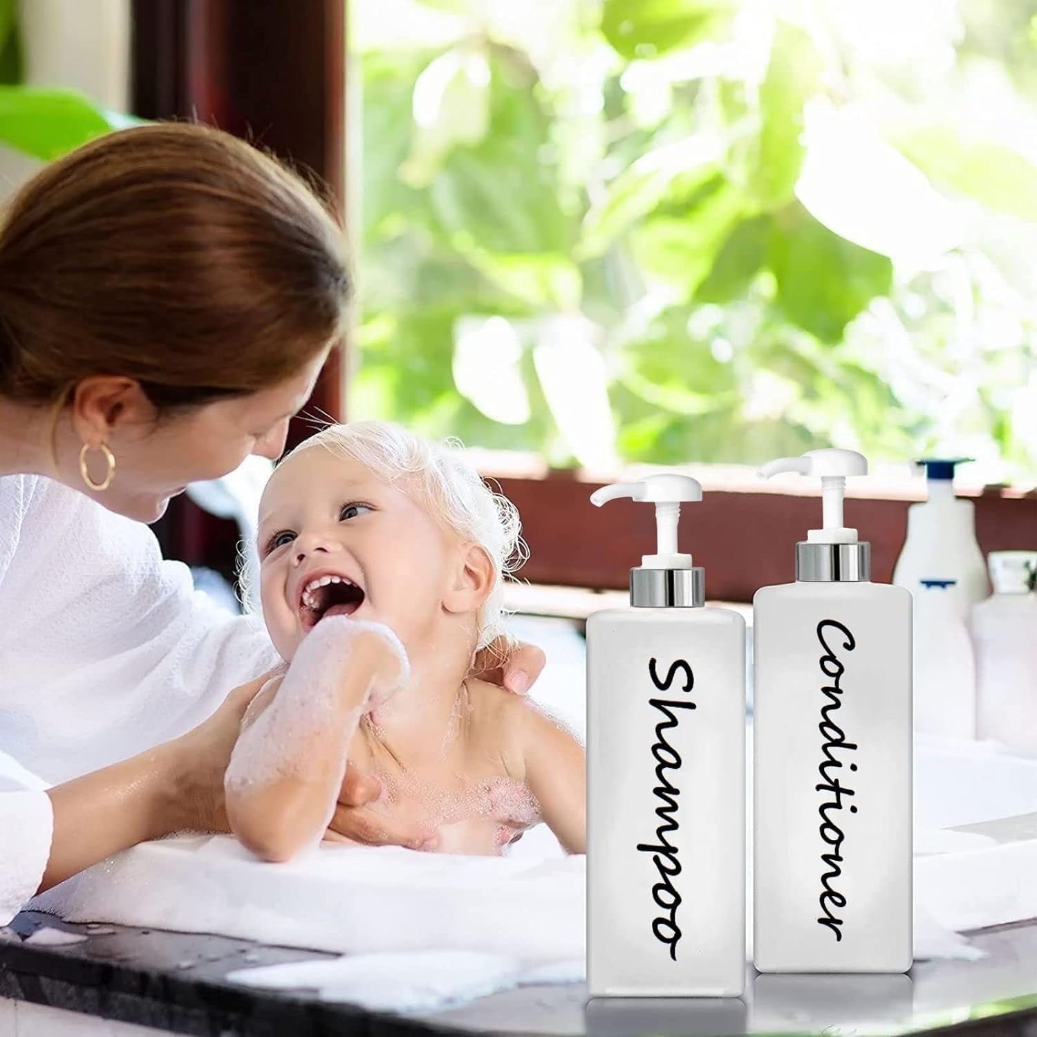 - Including: 1 × pump bottle with ''Shampoo'' font; 1 × pump bottle with ''Conditioner'' font; 1 × pump bottle with ''Body wash'' font; 1 × packing box