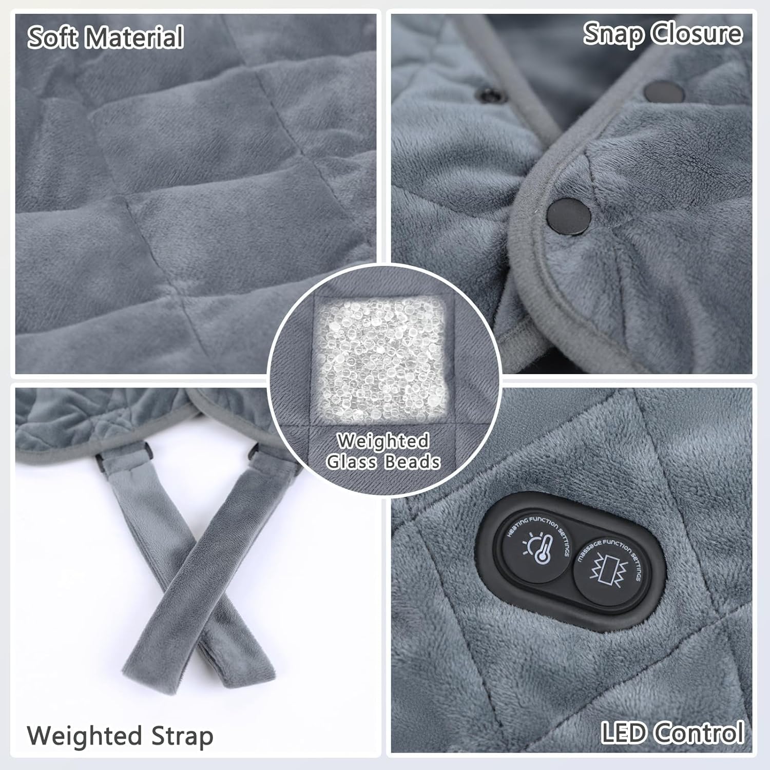 - 2.2 lbs Weighted Design And Snug Fit: The neck and shoulder heating pads have slightly weighted edges and are filled with micro-glass beads for a better fit around your neck and shoulders. Do not worry about the heat pad slipping or falling off because it is secured with 4 snaps and 4 straps, ensuring fit and reducing heat loss