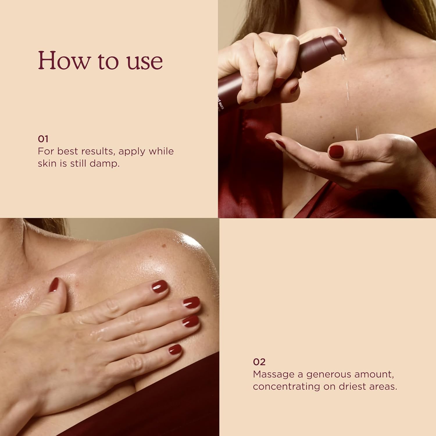 - HOW TO USE: After shower or bath, massage Good Aura all over your body, focusing on target areas. Enjoy soft, glowing skin that feels amazing, never oily.