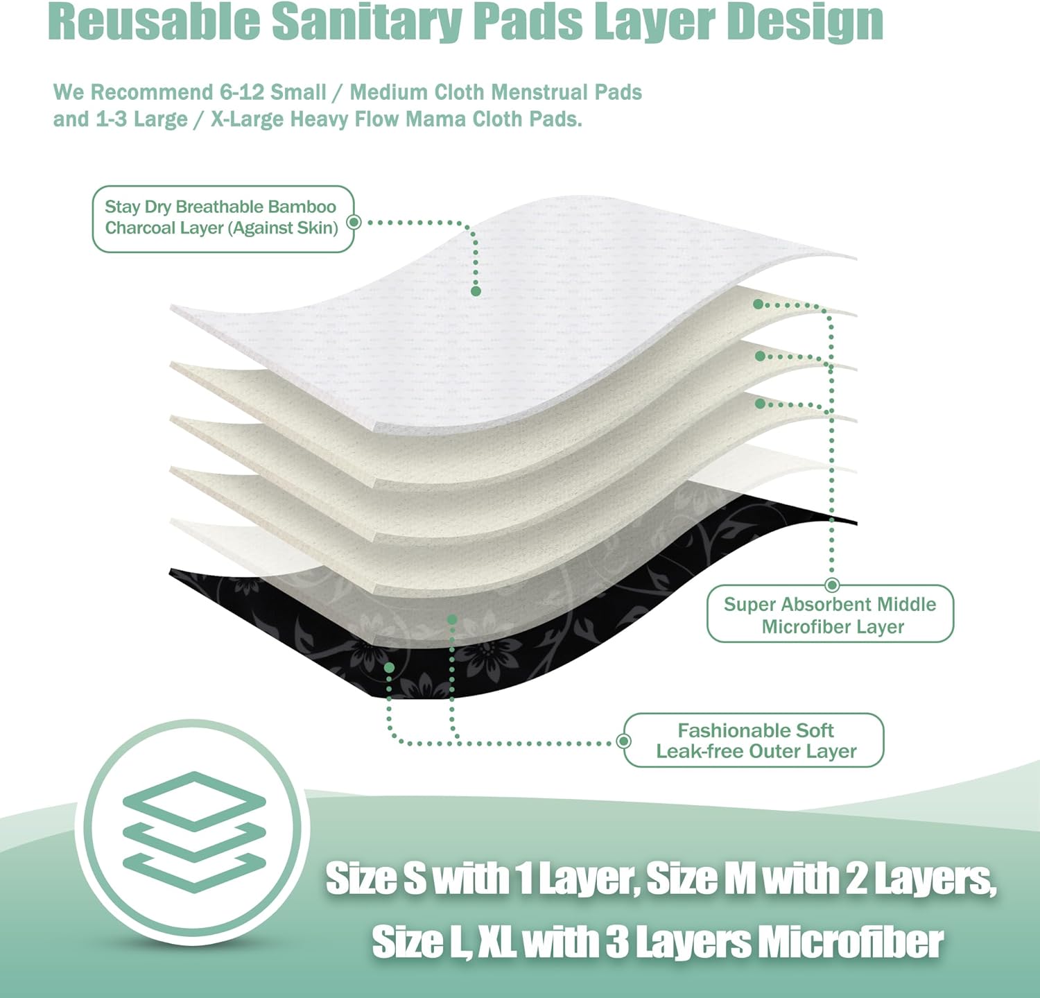 - CHARCOAL INNER LAYERS of these cloth menstrual pads is soft with maximum and have a stay dry surface.The dark color is forgiving of stains and Not only great at soaking up liquid, smells are neutralized.Middle layers microfiber make this reusable sanitary napkin super absorbent and a new trend in baby cloth diapers too.