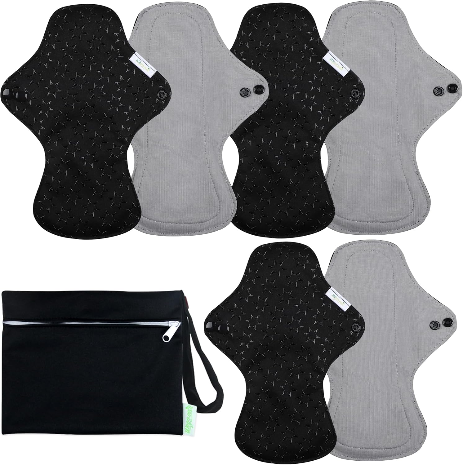 wegreeco 6 Pcs Reusable Menstrual Pads, Ultra Absorbent Cloth Pads for Heavy Flow, Sanitary for Teens, Women, Nonslip, Grey Inner, Black Outer, Medium