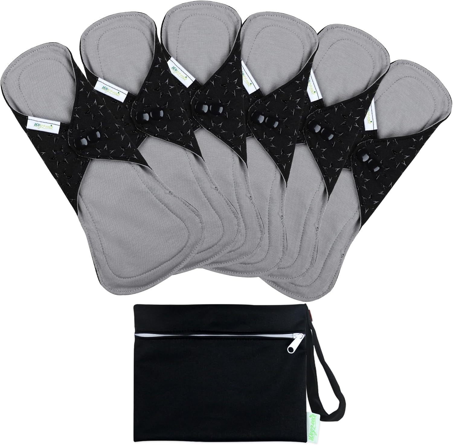 wegreeco 6 Pcs Reusable Menstrual Pads, Ultra Absorbent Cloth Pads for Heavy Flow, Sanitary for Teens, Women, Nonslip, Grey Inner, Black Outer, Small