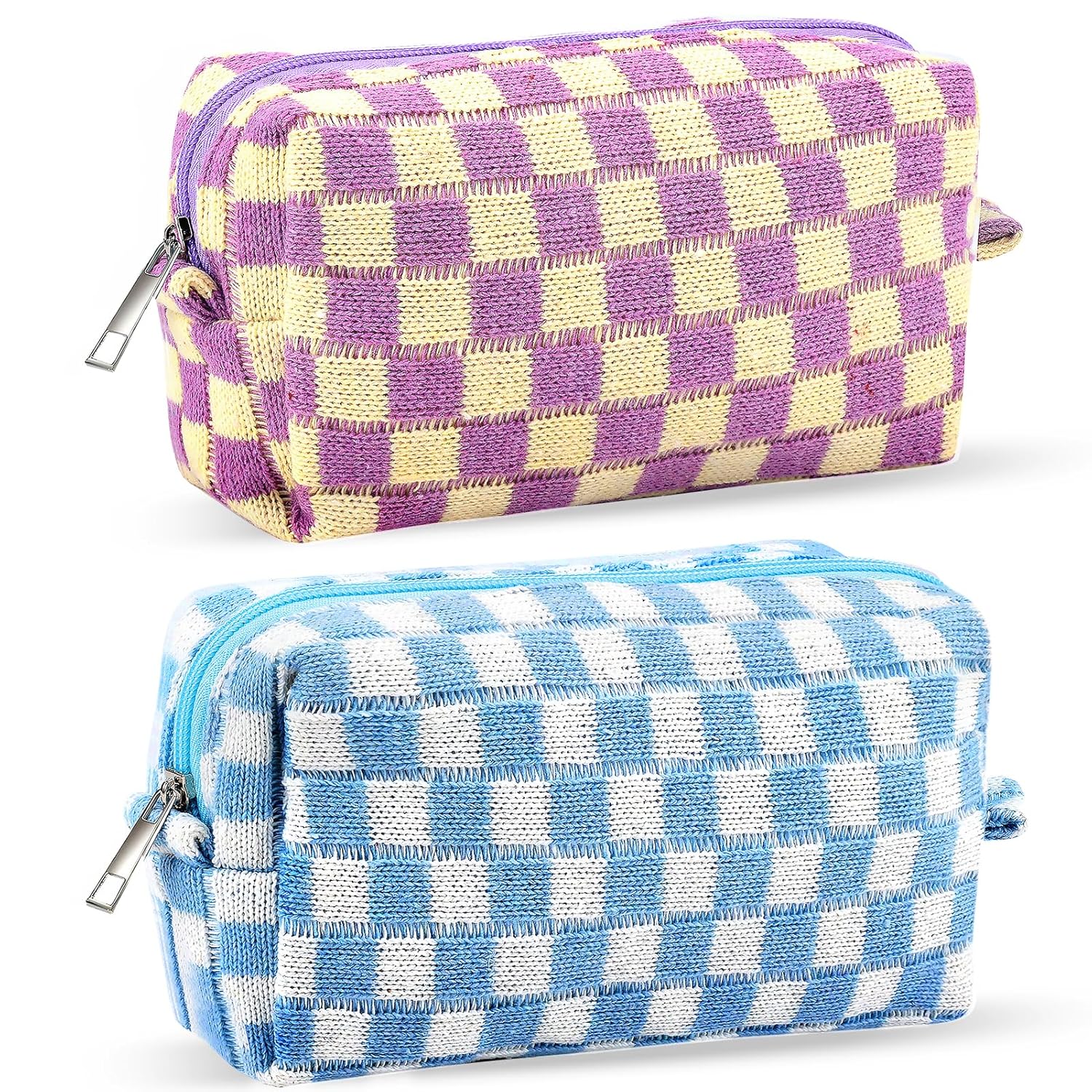 - LIGHT WEIGHT AND EXCELLENT WORKMANSHIP: The cute makeup pouch is made of soft knitted fabric and is comfortable, soft and lightweight. Checkered travel make up bag folds up when not in use and fits in a large bag without taking up space. The metal zipper of the cute pencil case keep your items secure and organized inside. Cosmetic bag accessories set for women