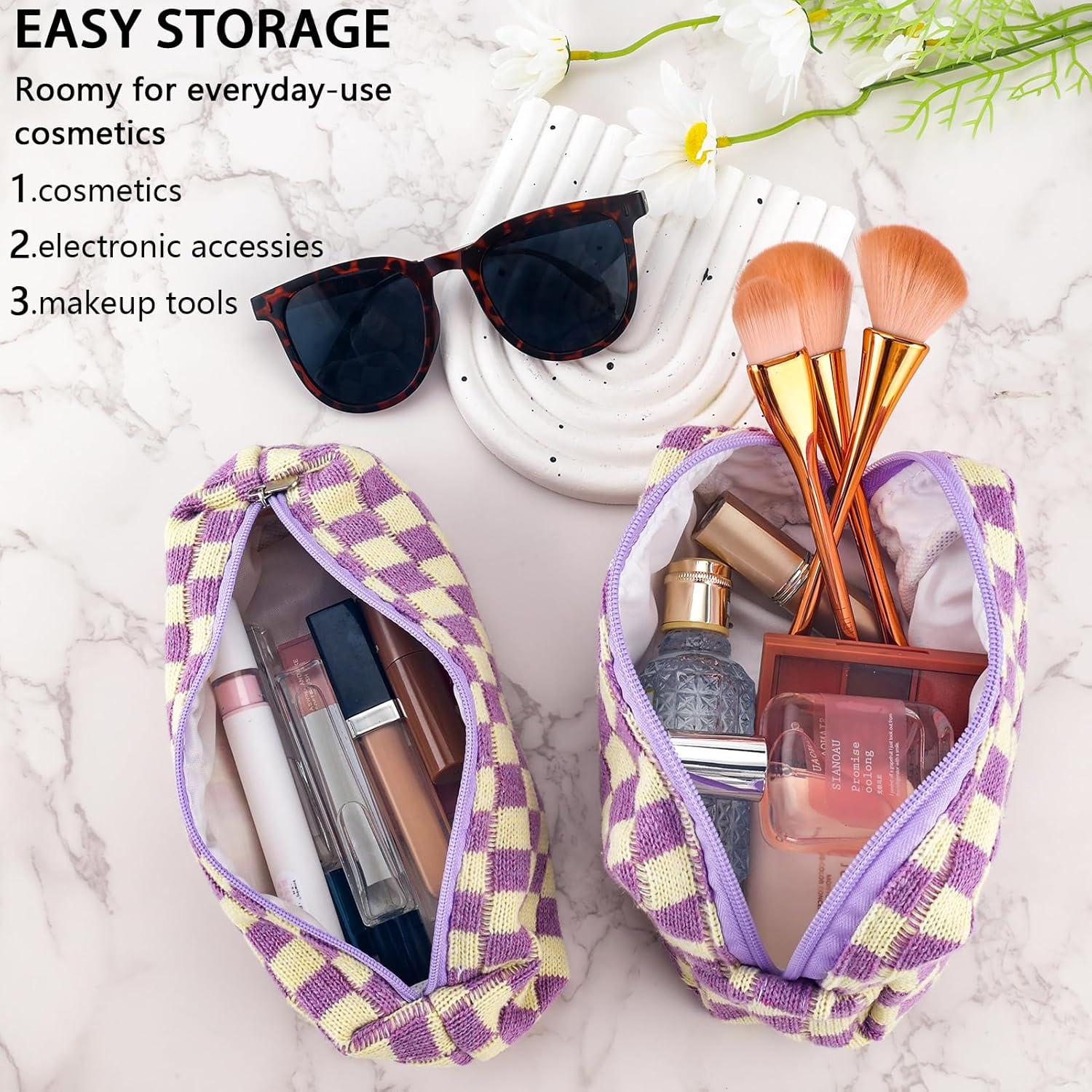 - LARGE CAPACITY AND PREMIUM MATERIAL: The cute makeup bag measure 7×4 inches and 7.7×2.5 inches, easy to carry. The checkered makeup bag is made of soft knitted fabric, easy to clean. The smaller ones can be used as pencil case or pencil pouch. This makeup travel bag can also hold small items such as makeup, skincare products, lipstick, eye shadow, eyebrow brush, etc. Makeup storage bag for women toiletries