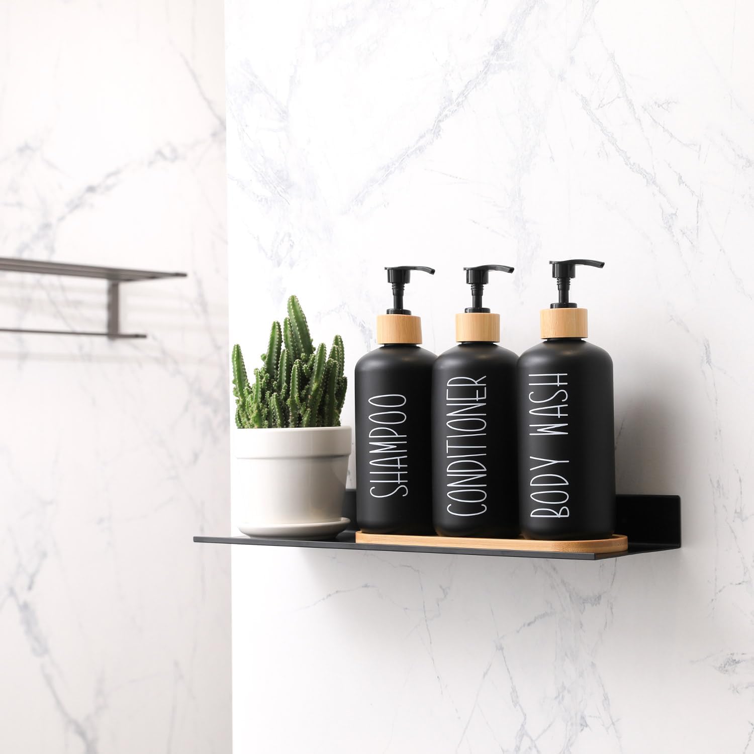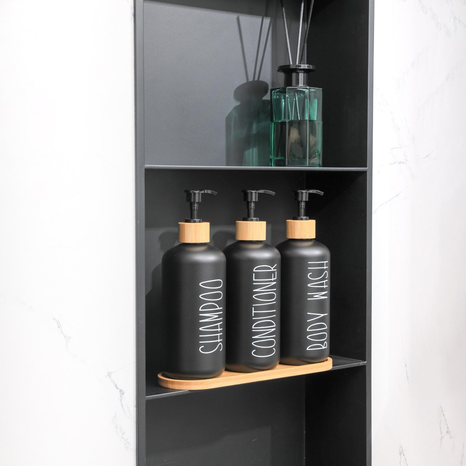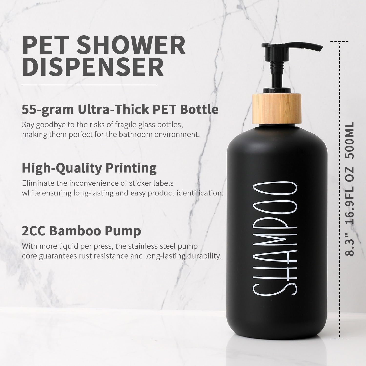 MOMEEMO Black Shower Soap Dispenser Set, Contains 3 Extra-Thick PET Plastic Bottles with Bamboo Pumps, Shampoo Bottles Refillable with Pump Perfect for Guest Room Must Haves. (Black)