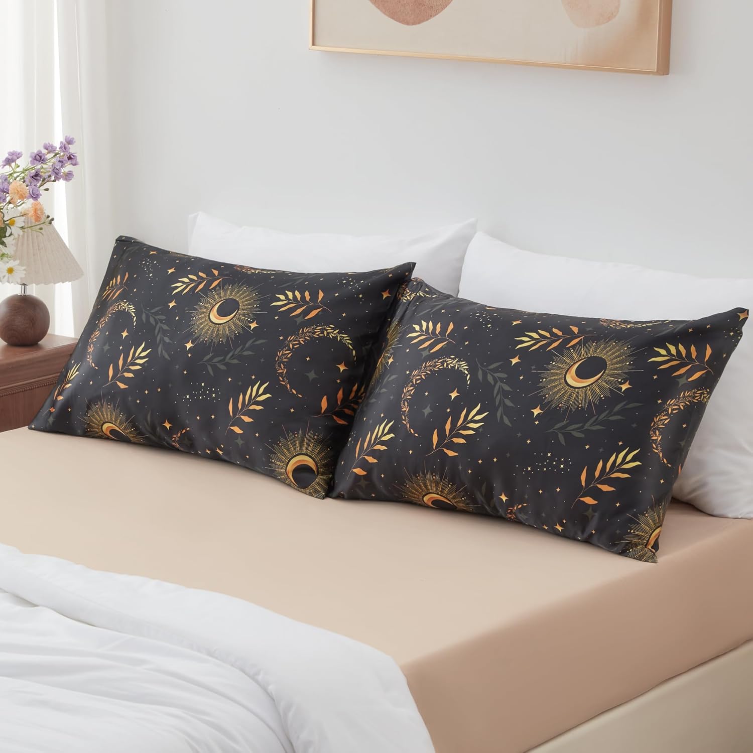 EXQ Home Satin Pillowcase for Hair and Skin - Multicolor Printed Black Moon Silk Pillowcase 2 Pack 20x26 inches - Standard Size Satin Pillow Cases Set of 2 with Envelope Closure