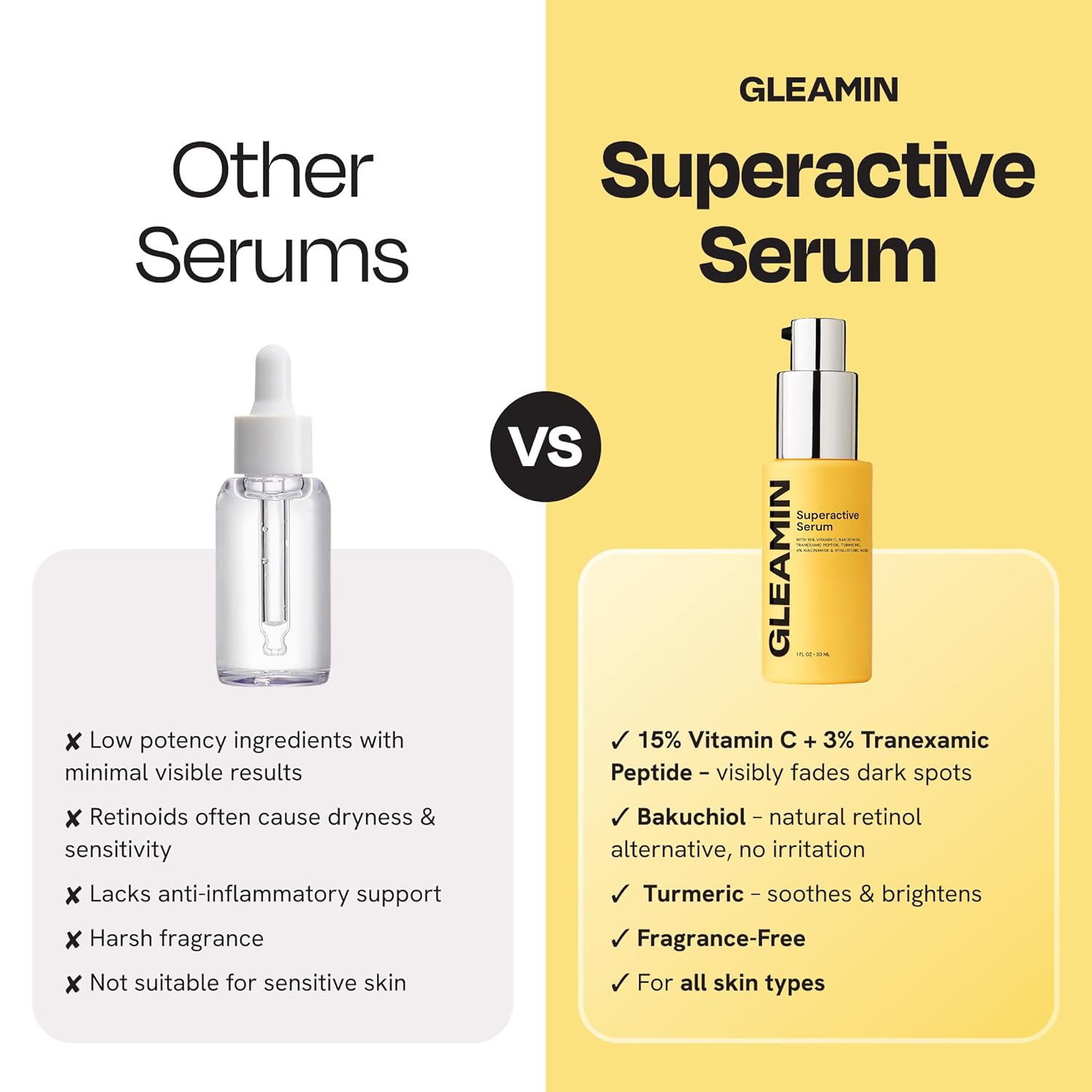 Gleamin Superactive Vitamin C Serum for Face with 15% Vitamin C, Niacinamide, Bakuchiol & Hyaluronic Acid – Skin Brightening Facial Serum for Women & Men – Dark Spot Remover & Radiant Glow – 1 fl oz