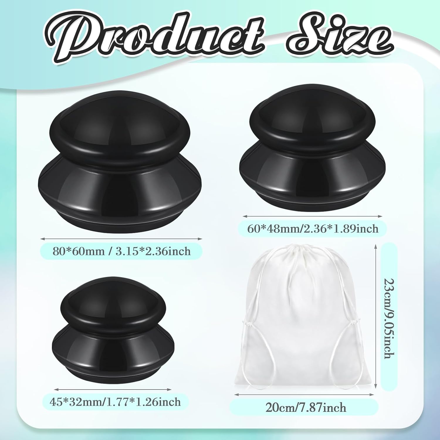 - Varied Sizes and Multipurpose Use: this silicone cups come in a variety of sizes to suitably match your needs; Large cups measure 3.15 x 2.36 inches, medium 2.36 x 1.89 inches, and small 1.77 x 1.26 inches; Whether your aching body needs to relieve pain on your shoulders, back, waist, arms, or legs, this massage cupping set has got you covered; Made of durable material and featuring a black color, our products are designed for a wide range of applications