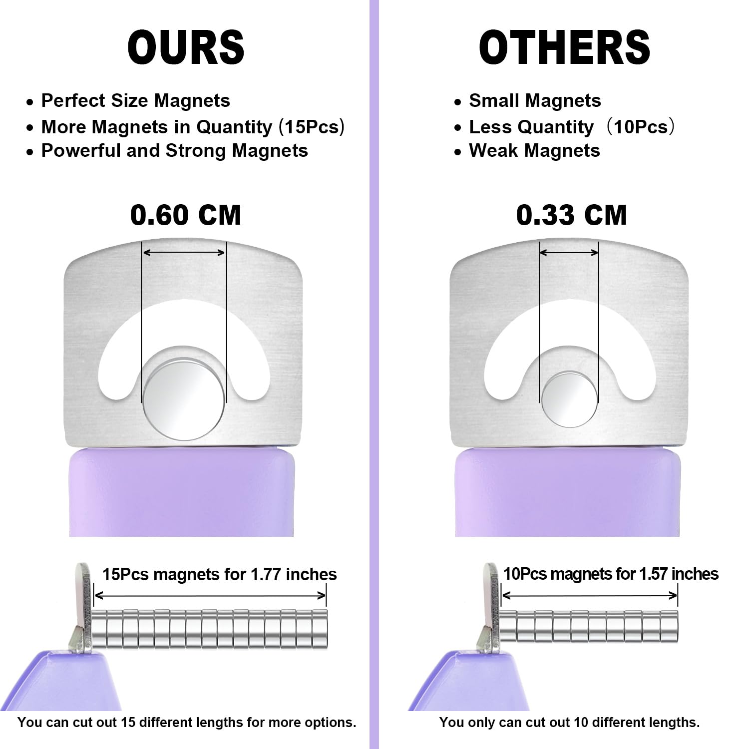 - ✂️Powerful Magnet Sizers -- Easiest nail hack to get your tips the same length in secons!Our magnets have a total length of 1.6 inches, the height of each pcs is 0.14 inches, you can adjust the desirable length by using different numbers of magnets.If you are worried that the magnets will move, you can fix the first magnet with glue on the clipper.