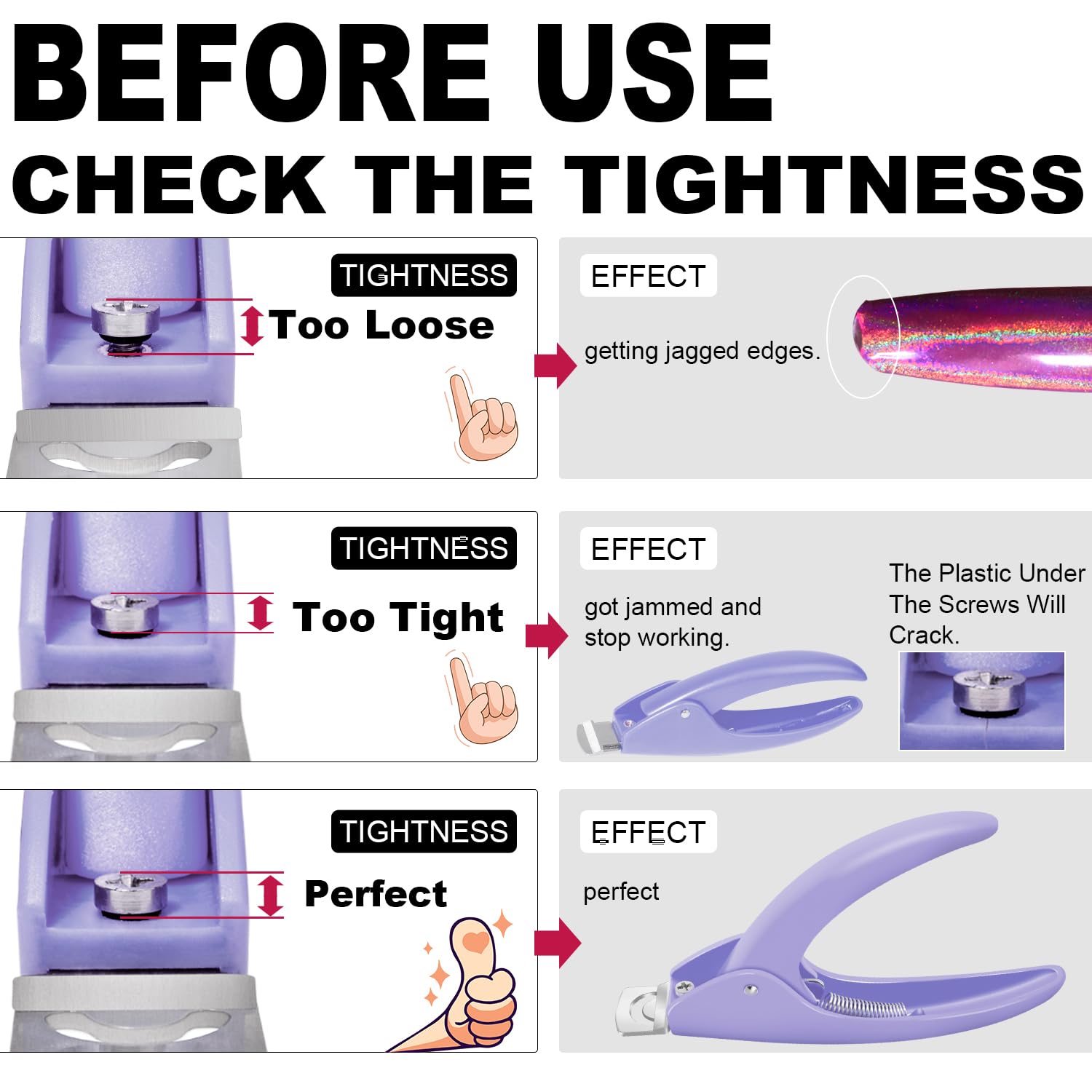 - ✂️Sharp Blade and Smooth Nails -- Cut acrylic nails quickly and smoothly with this sharp-blade and strong-springe clipper. The comfortable handle and safe edge design make cutting nail tips a breeze. Please check the tightness of the screw before use, perfect tightness will make sure you clipper work well.