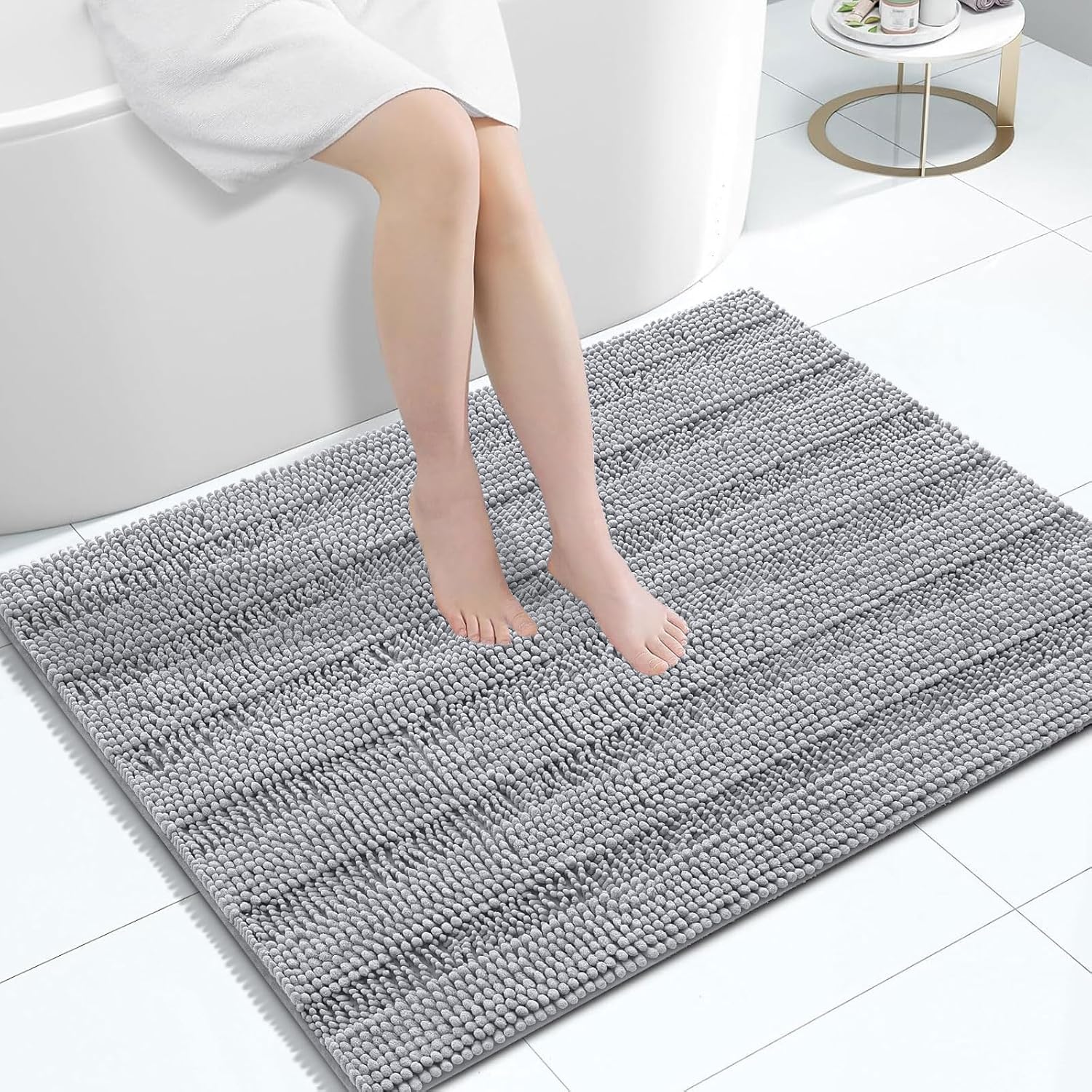 Grandaily Chenille Striped Bathroom Rugs 40x32, Extra Thick and Absorbent Bath Mats, Non-Slip Soft Plush Shaggy Shower Carpet, Machine Wash Dry, Bath Rug for Bathroom, Light Grey