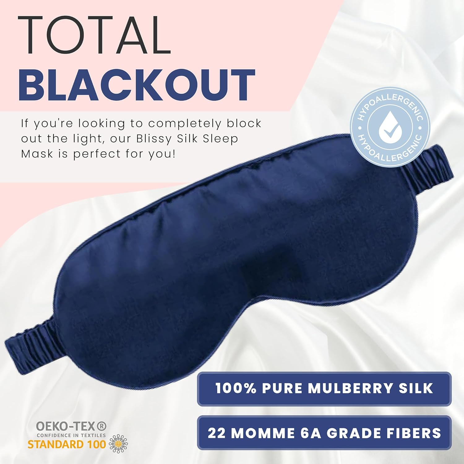 - TOTAL BLACKOUT - If you're looking to completely block out the light, our Blissy Silk Sleep Mask is perfect for you! Made with 100% pure Mulberry silk and 22 momme 6A grade fibers, this mask will keep the light out and help you get a good night's sleep.