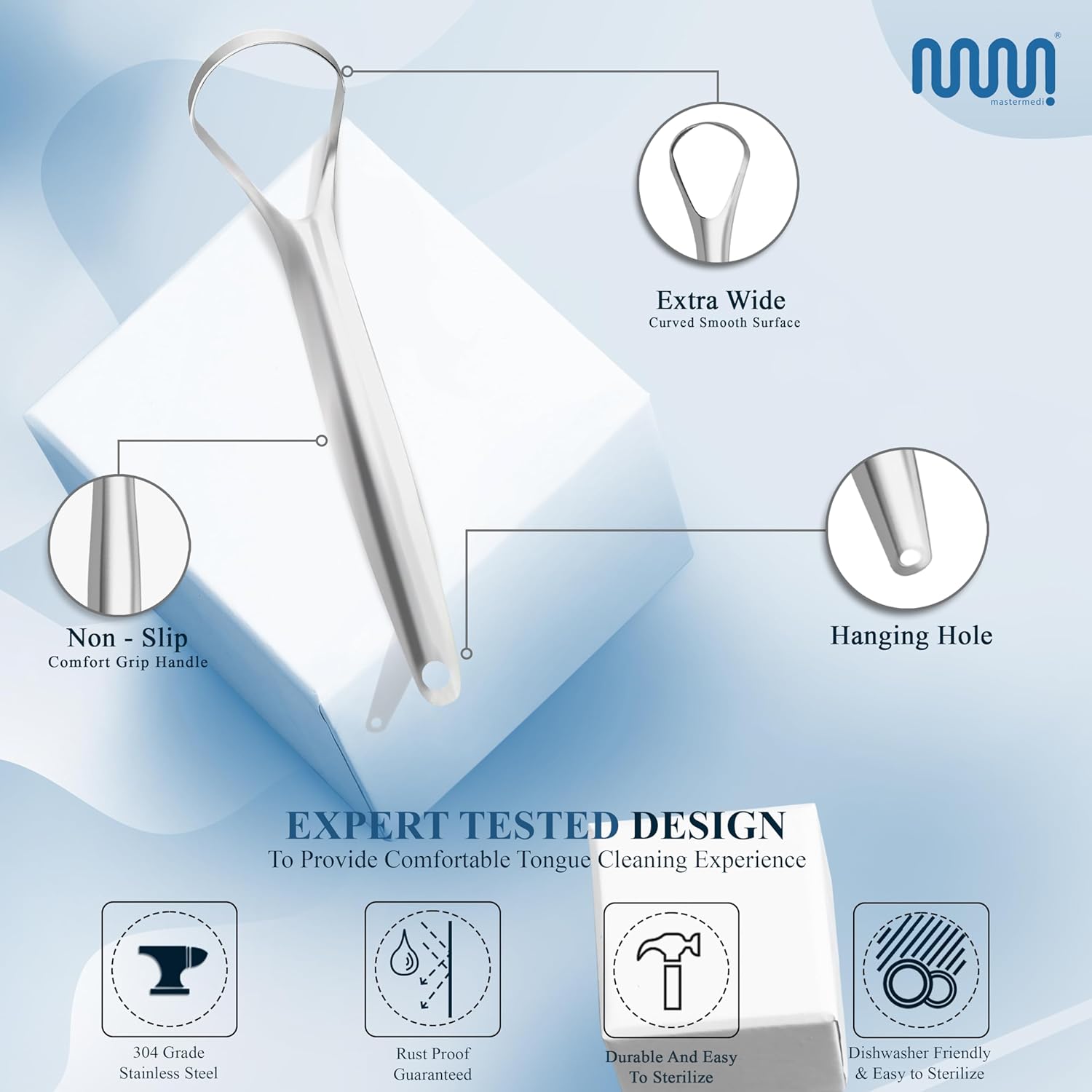 MasterMedi Tongue Scraper for Adults, 100% Stainless Steel for Bad Breath, Easy to Use, Tongue Cleaner for Oral Care (Pack of 3 with 1 Case)