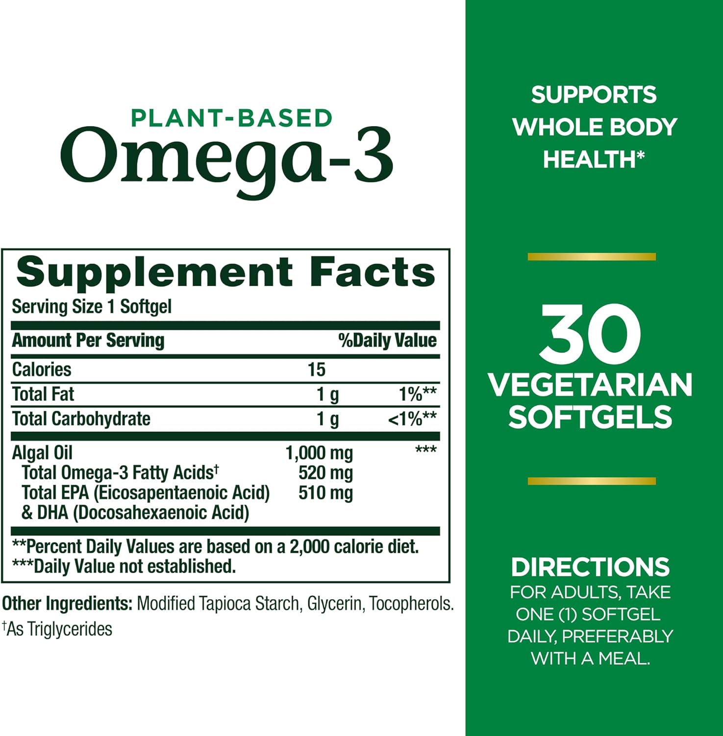 Nature's Bounty Omega 3, Plant-Based Omega 3 Fatty Acid Suppement, 1000mg, Supports Whole Body Health Including Heart, Skin, Joint, 30 Vegetarian Softgels, Fish Oil Alternative