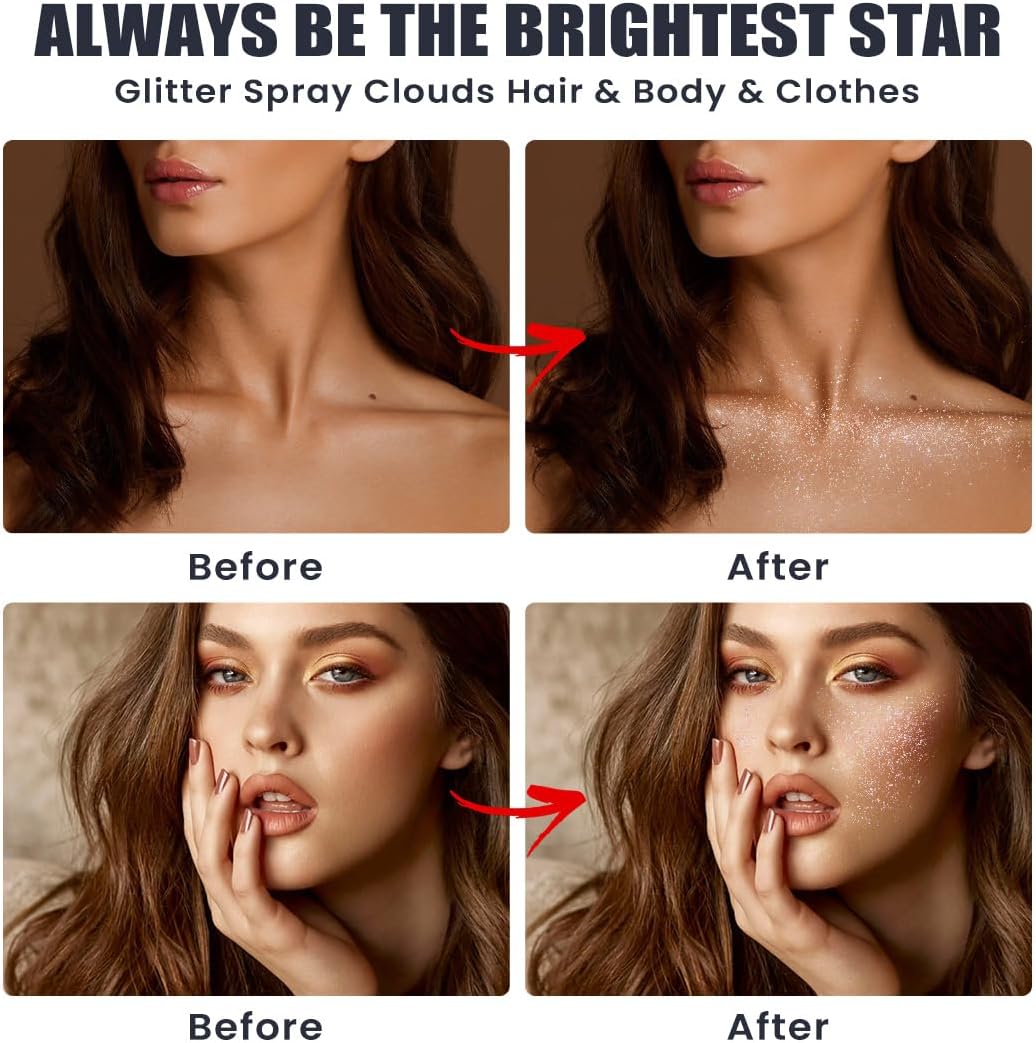 - Multi-Purpose Glitter Spray: Our body glitter spray is made of glitter particles, delivering a charming shimmer effect. You can spray it on your body, hair, face, skin, and even clothes. It will make you the center of attention under the lights at parties or nightclubs
