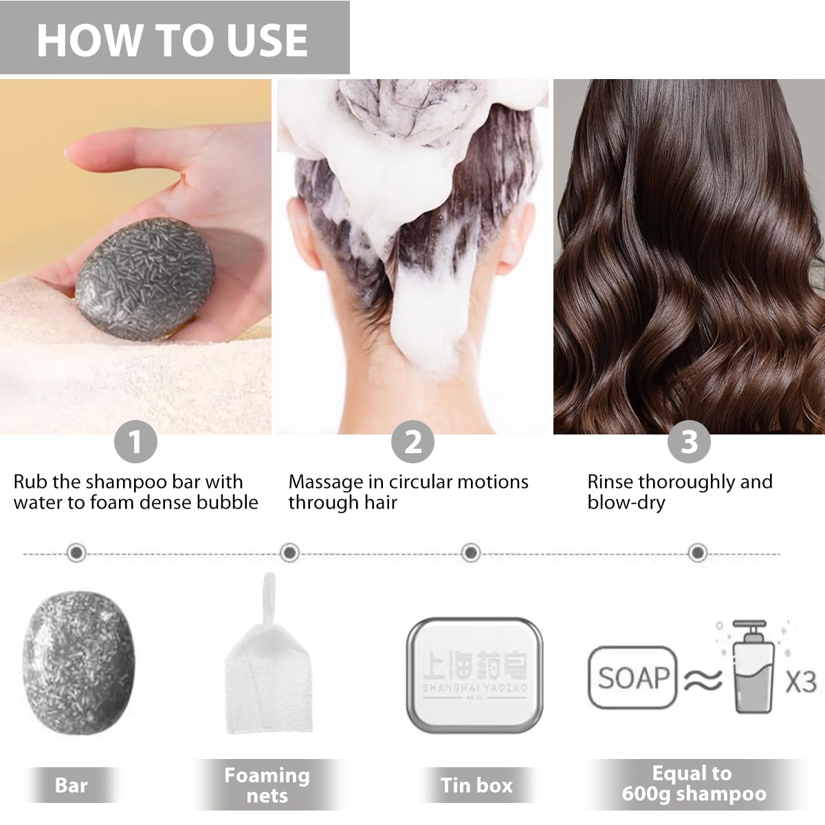 - All Hair Types: The shampoo bar soap is suitable for any type of hair including curly, dry, oily, frizzy, gray, and color-treated. Super rich with bubble, natural ingredients gently clean the hair and scalp, balances oil in scalp, nourishes hair roots, resulting in soft, strengthen, rejuvenated hair