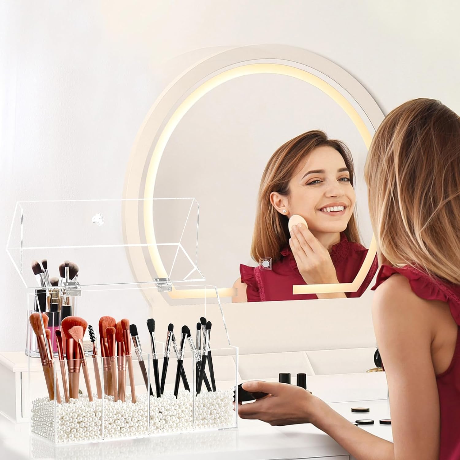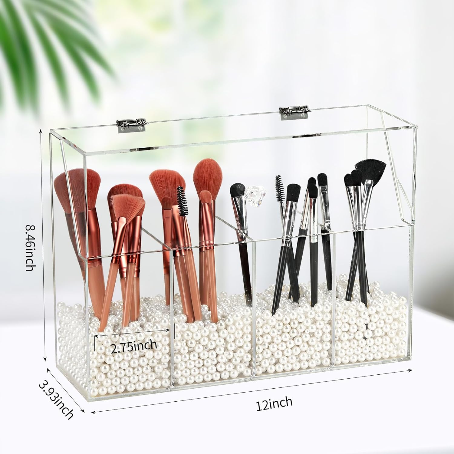 - 4 SLOTS MAKEUP BRUSH ORGANIZER (Pearl and brush NOT included)- Our makeup brush holder comes with a dust cover, 4 brush holder compartments. This makeup brush organizer measures 12.2"L x 4"W x 8.5"H, large capacity to hold and decorate various makeup brushes.(Pearl and brush NOT included)