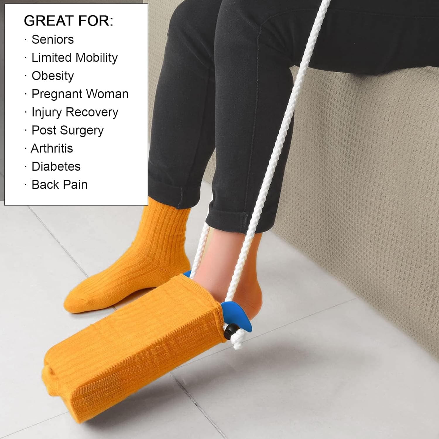 - EASILY PUT ON SOCKS: Easily put on your own socks or hosiery with the sock assist device. Perfect for those recovering from surgery, injury or those with limited mobility. Latex-free plastic shell contours to slide over the foot and heel, pulling up the sock with ease.