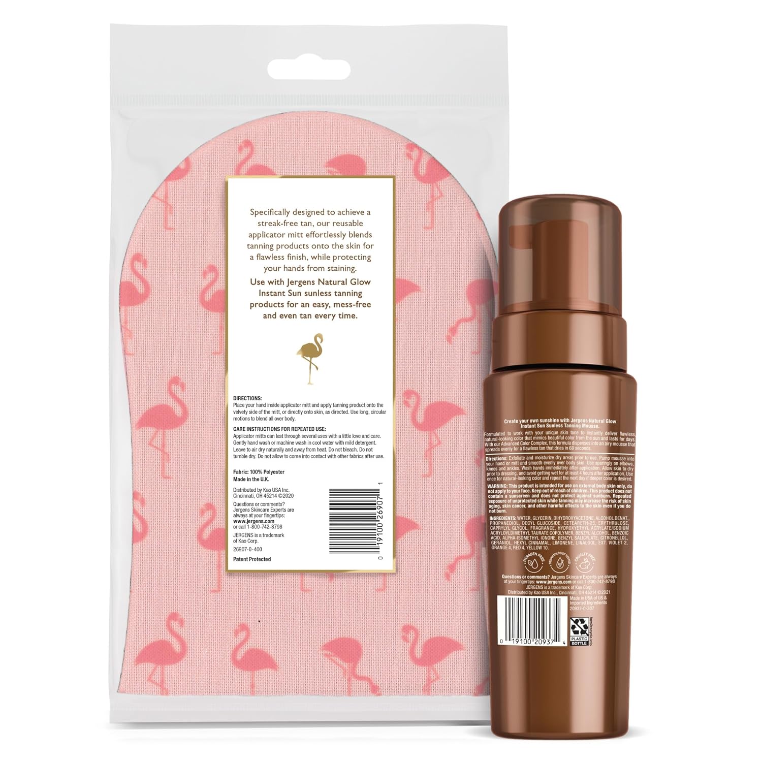 - SUNLESS TANNER BUNDLE - This Self Tanning Bundle includes Jergens Natural Glow Instant Sun Self Tan Mousse and Application mitt